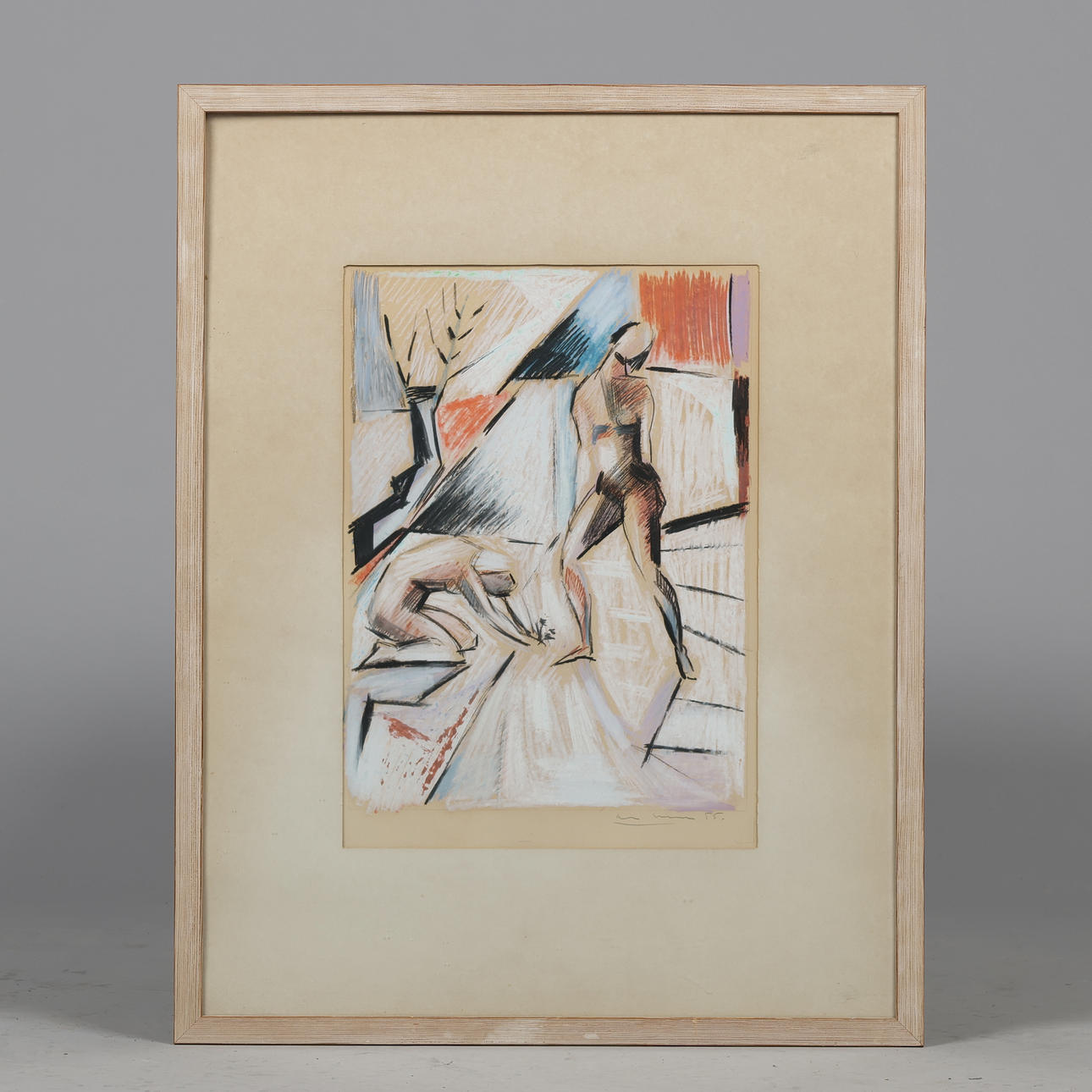 Unknown artist, composition with figures, pastel on paper, signed and dated 1955. Motif h.38 x 28 cm, framed dimensions 68,5 x 53,5 cm.
