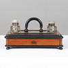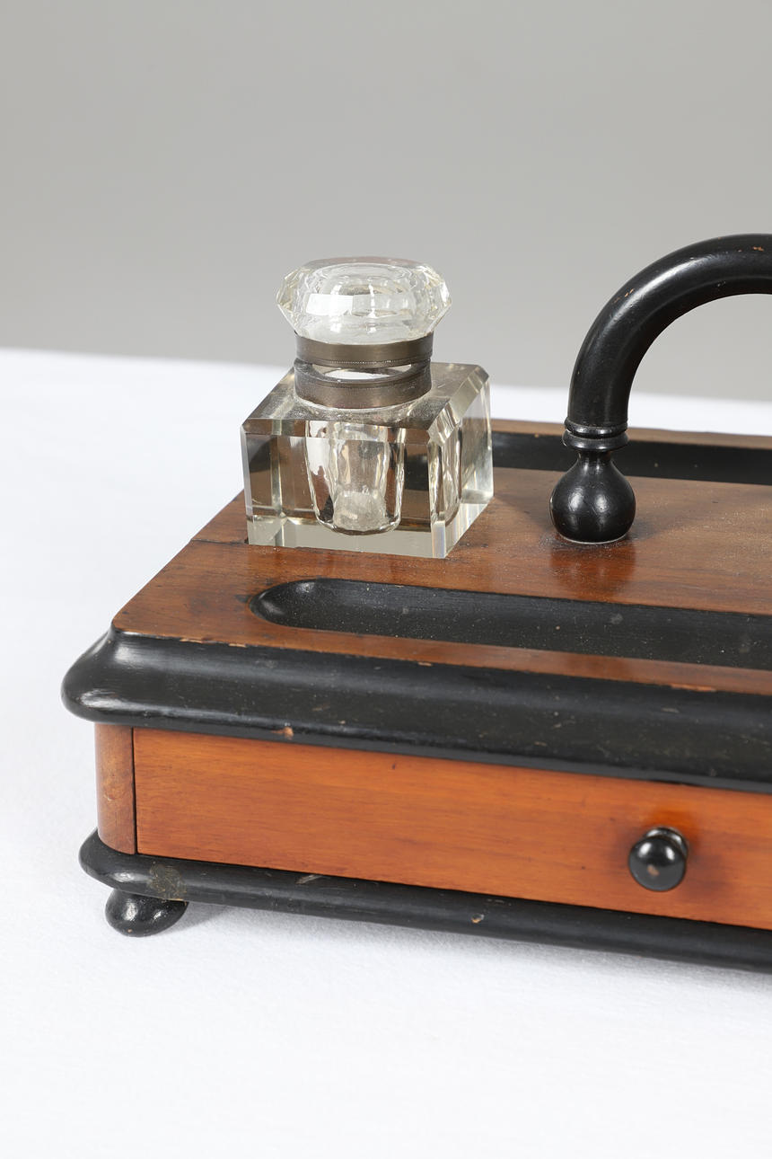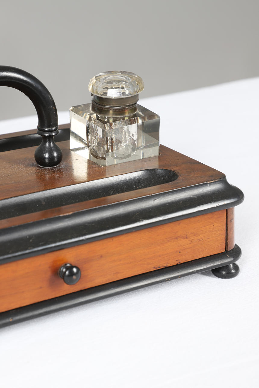 A large walnut and ebonised inkstand, with two glass inkwells and a drawer to the base. 35cms by 24cms, 18cms high.