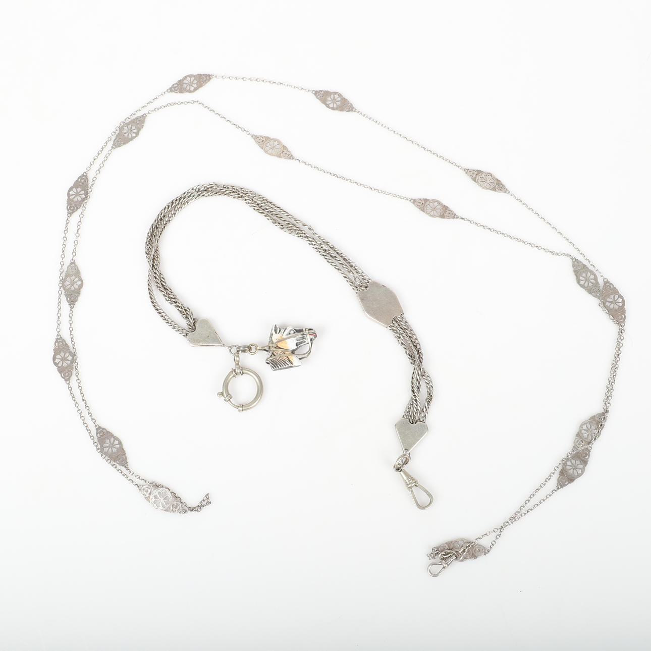4412934. WATCH CHAINS AND CHATELAINE, 15 pieces, white metal.
