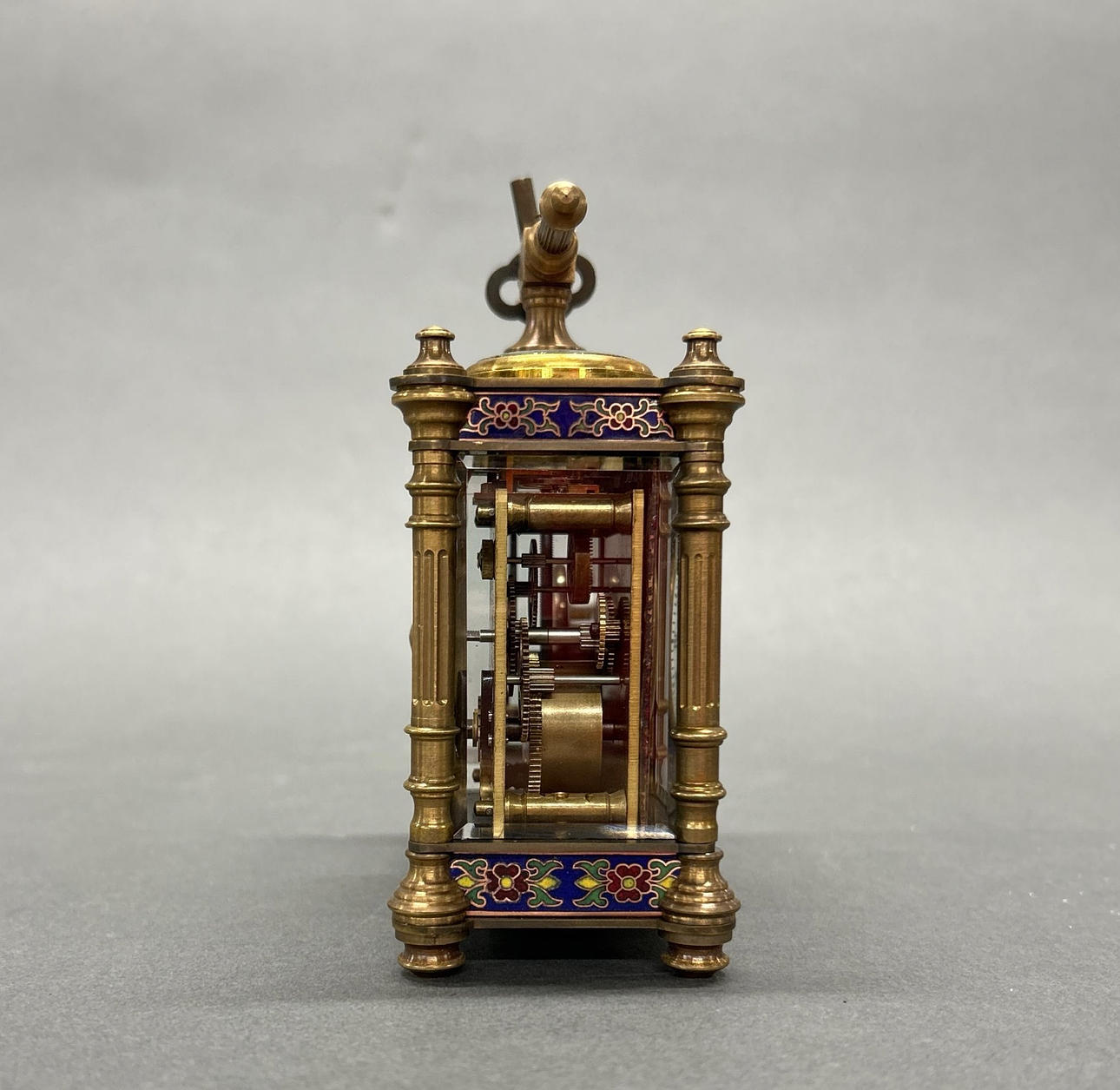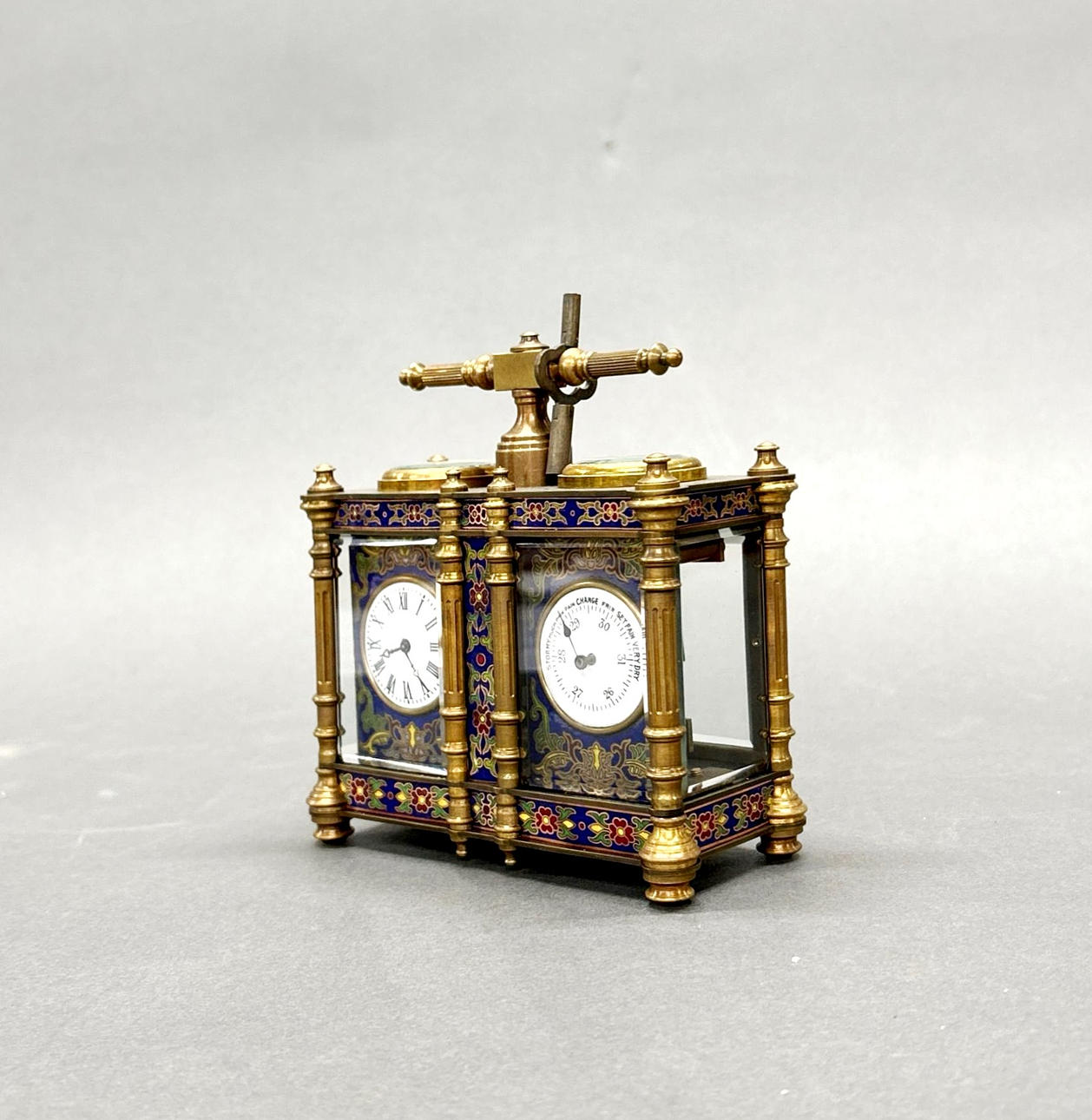 An enamelled brass carriage style clock barometer, H. 13cm, W. 12cm.