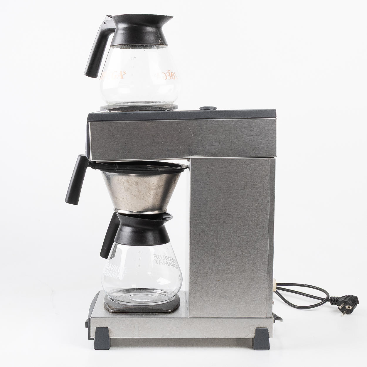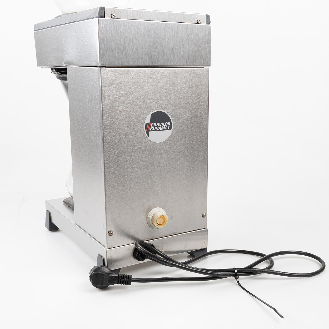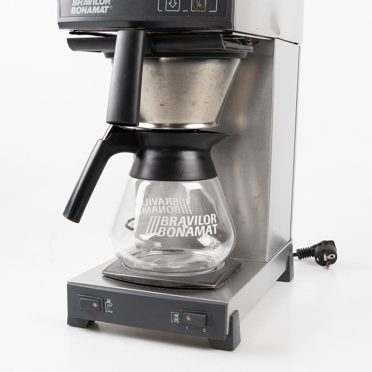 Coffee maker for office, restaurant, cafe, stainless steel for direct connection of water supply. A heating plate as well as a bridge plate. Bravilor Bonamat glass jug with lid, volume approx. 1.7 liters.