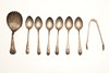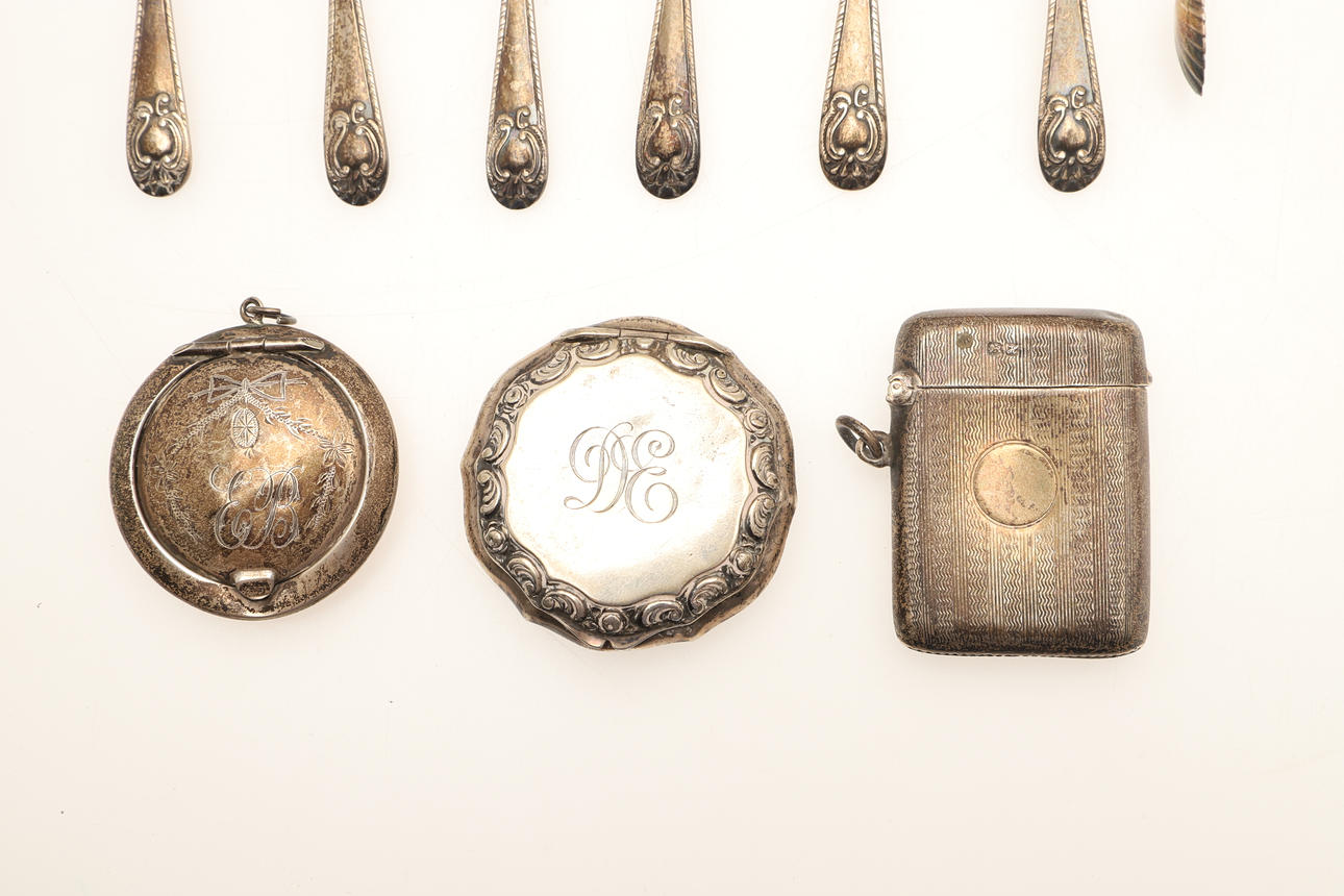 A Victorian Scottish silver shell caddy spoon by Robb & Whittet, Edinburgh 1843; together with a silver vesta, two silver compacts, set of six silver teaspoons with shell bowls, silver sugar nips and a fish knife, approx.weight 7.5toz.