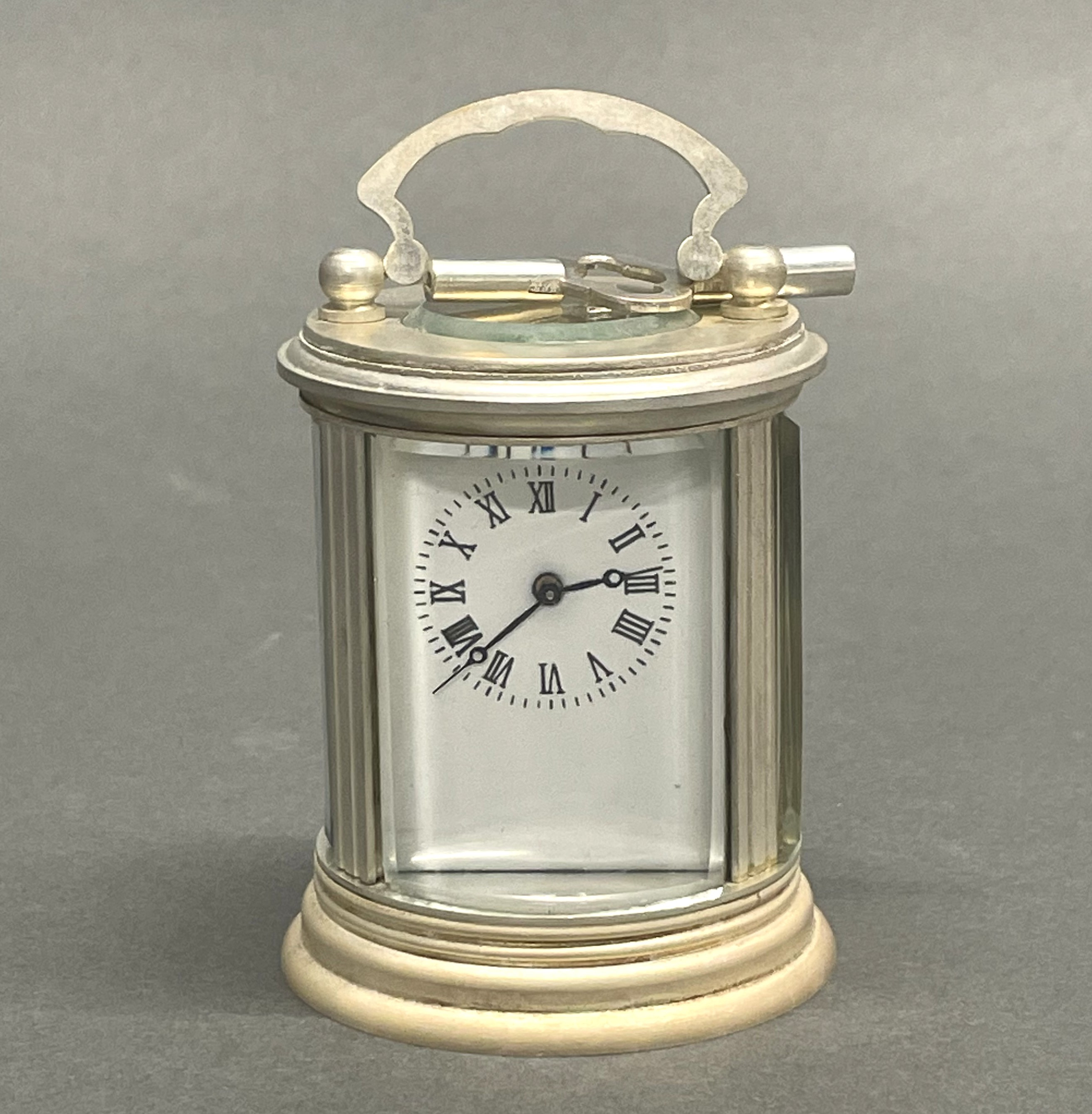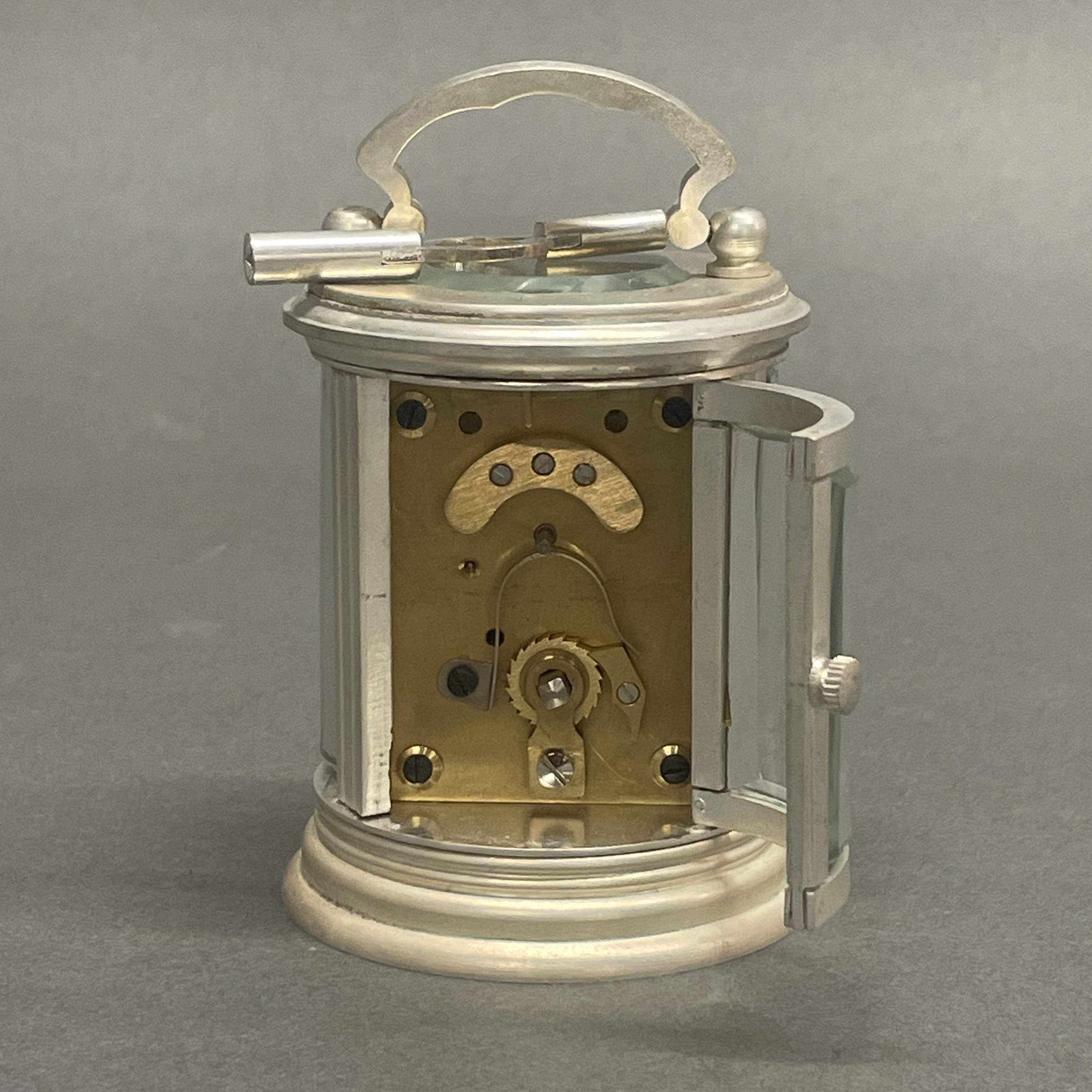 4413674. SMALL SILVERED BRASS CARRIAGE CLOCK.