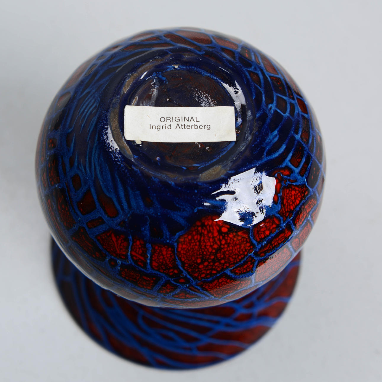 Background: One of the designers at Upsala-Ekeby who was closest to clay, the material, was Ingrid Atterberg (1920-2008). She experimented from the very beginning, like the schooled ceramist she was, with clays, glazes, and techniques. For example, she revived black clay, a mixture of red clay and manganese oxide, and made it an impactful feature in many art series, not only her own; she also produced a series, Sintergods, which succeeded in producing stoneware effects from the Uppland clay; she also found a way to use the effects of chamotte clay without having to twist it.