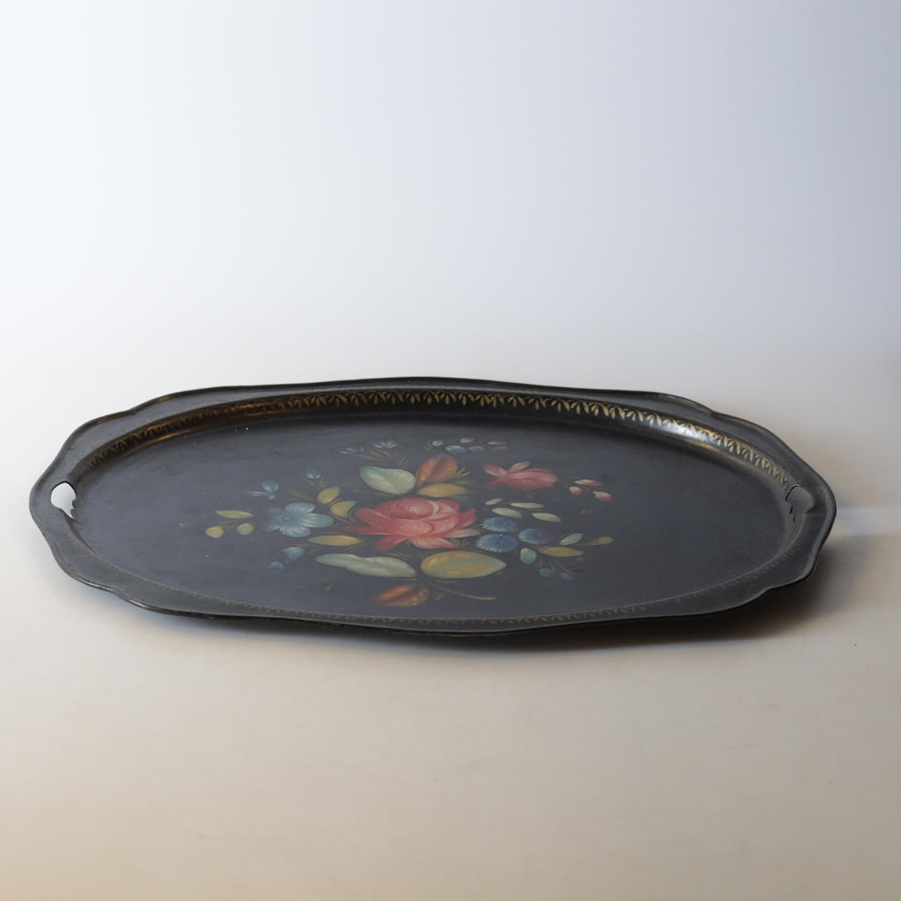 A tray in sheet metal with painted decor, Made in Russia. Length approx. 58 cm, depth approx. 45 cm.