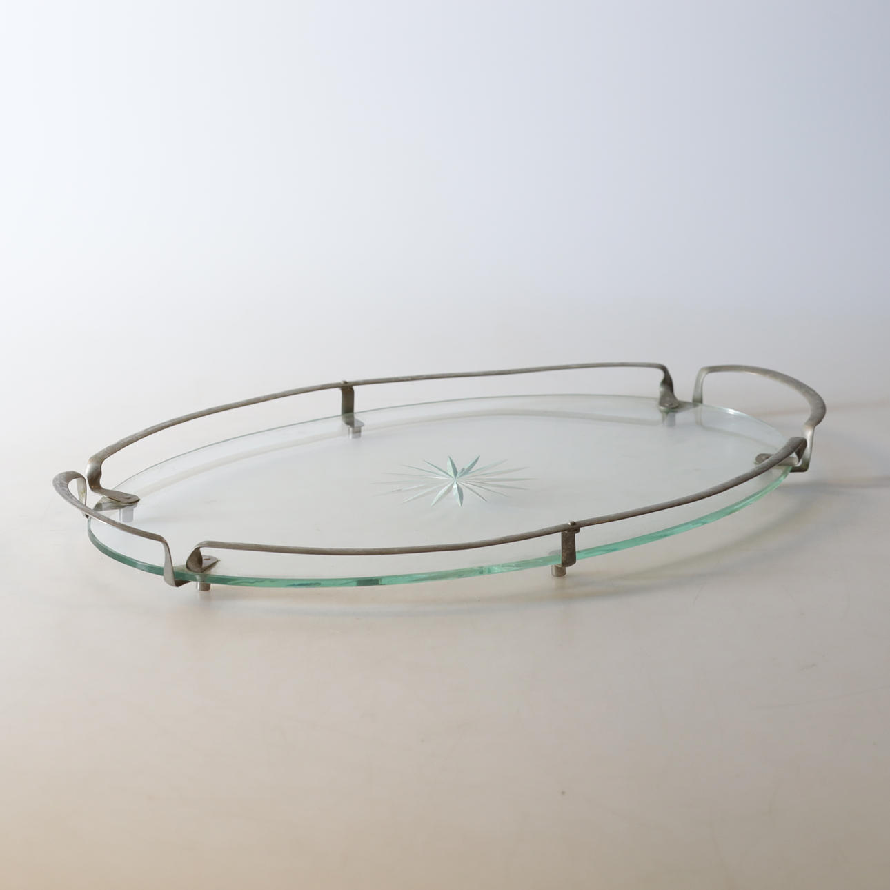 A Tray in glass and metal, length approx. 53 cm, depth approx. 32 cm.