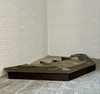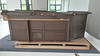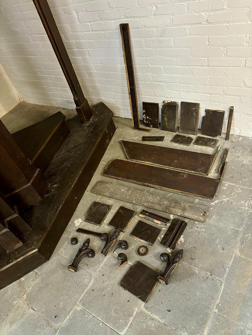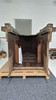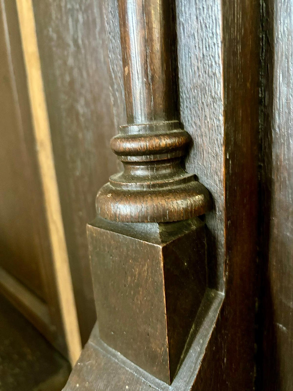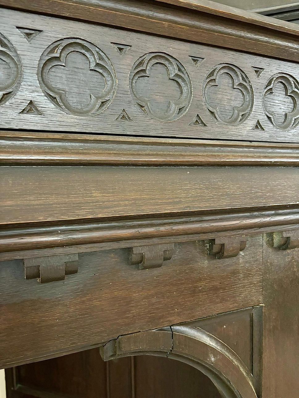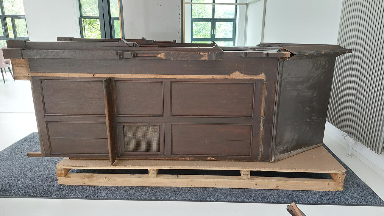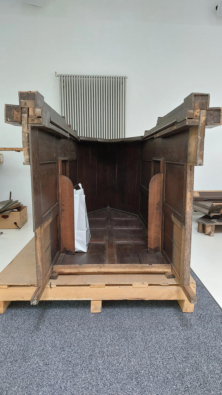 Softwood, dark brown glazed. In three parts. Central, narrow, rectangular body with pointed roof. Inside, the back and half door are divided on the front by recessed fillings in the form of a rectangular grid. Open front with pointed gable over cut-out donkey back. On the pilasters, two pillars placed in the middle. Open spaces mounted diagonally on the sides in a segmental arch. Circulating four-pass in the wreath gable. HxWxD: approx. H. 325 cm x W 290 cm x D 120 cm