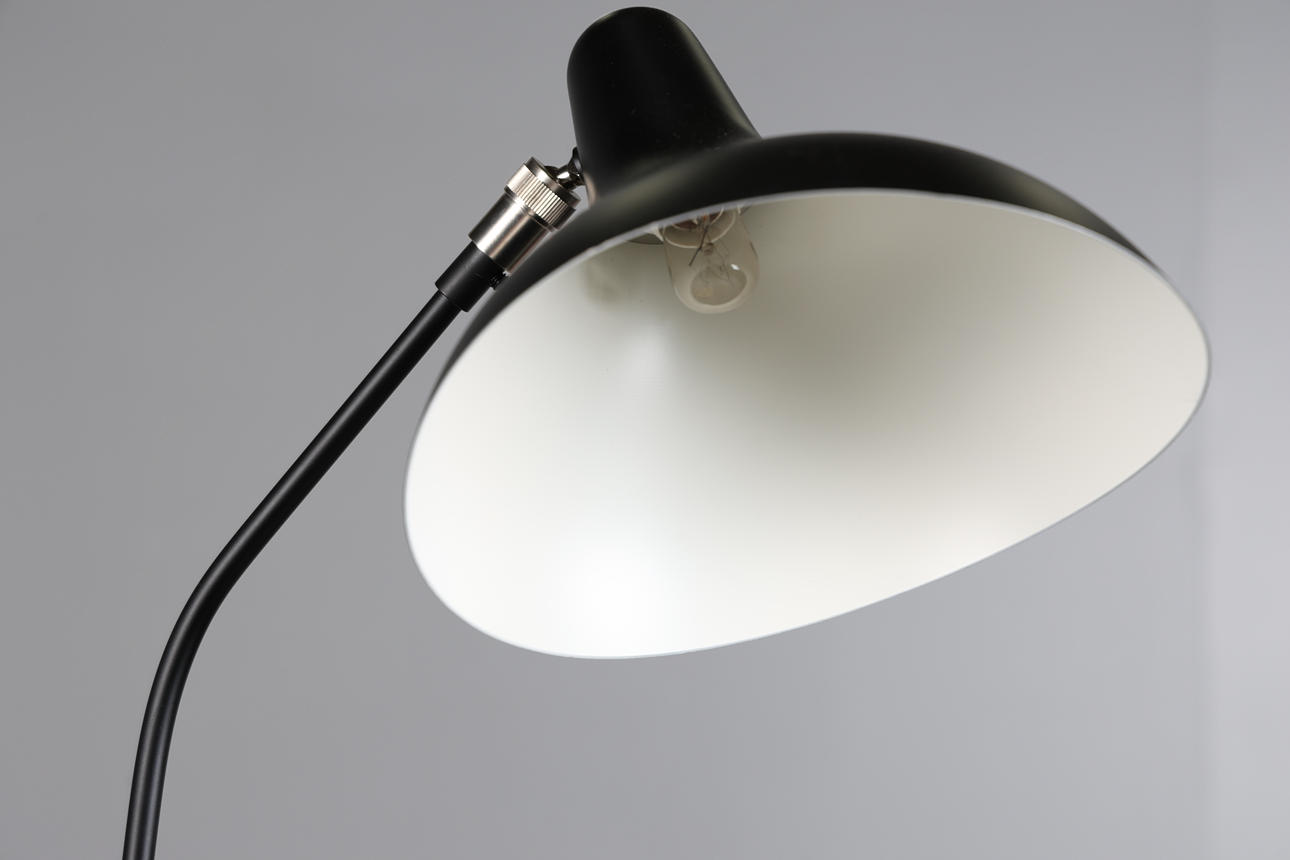 In the style of the Mantis BS1, the black floor standing lamp, with a shaped shade and a tripod base, 170cm height.