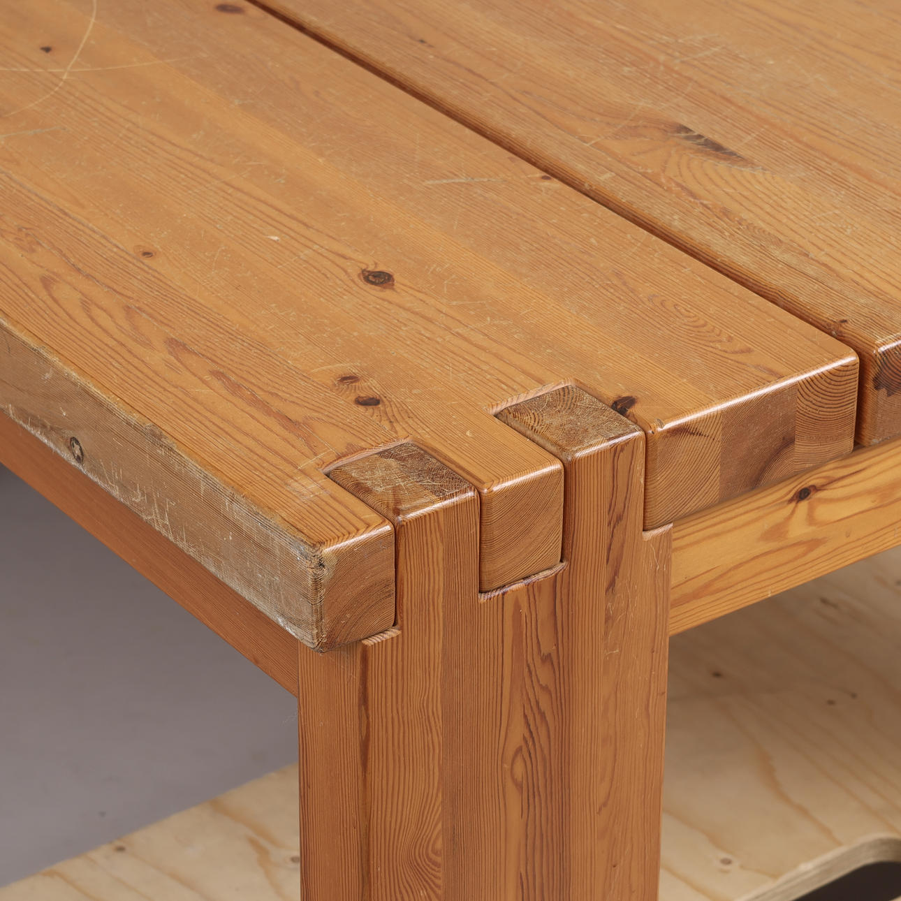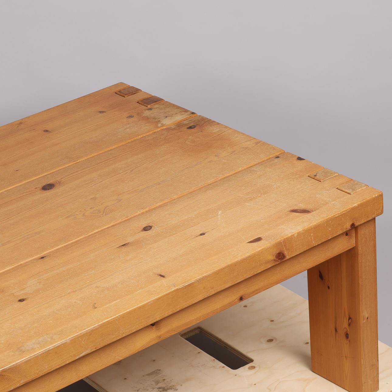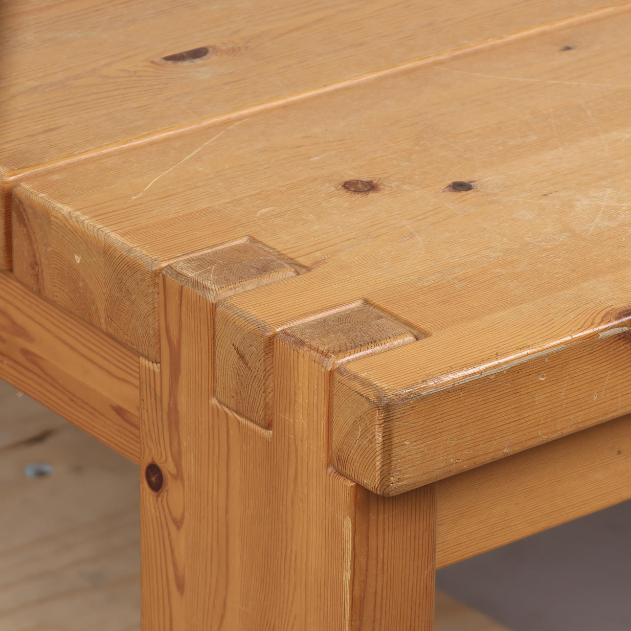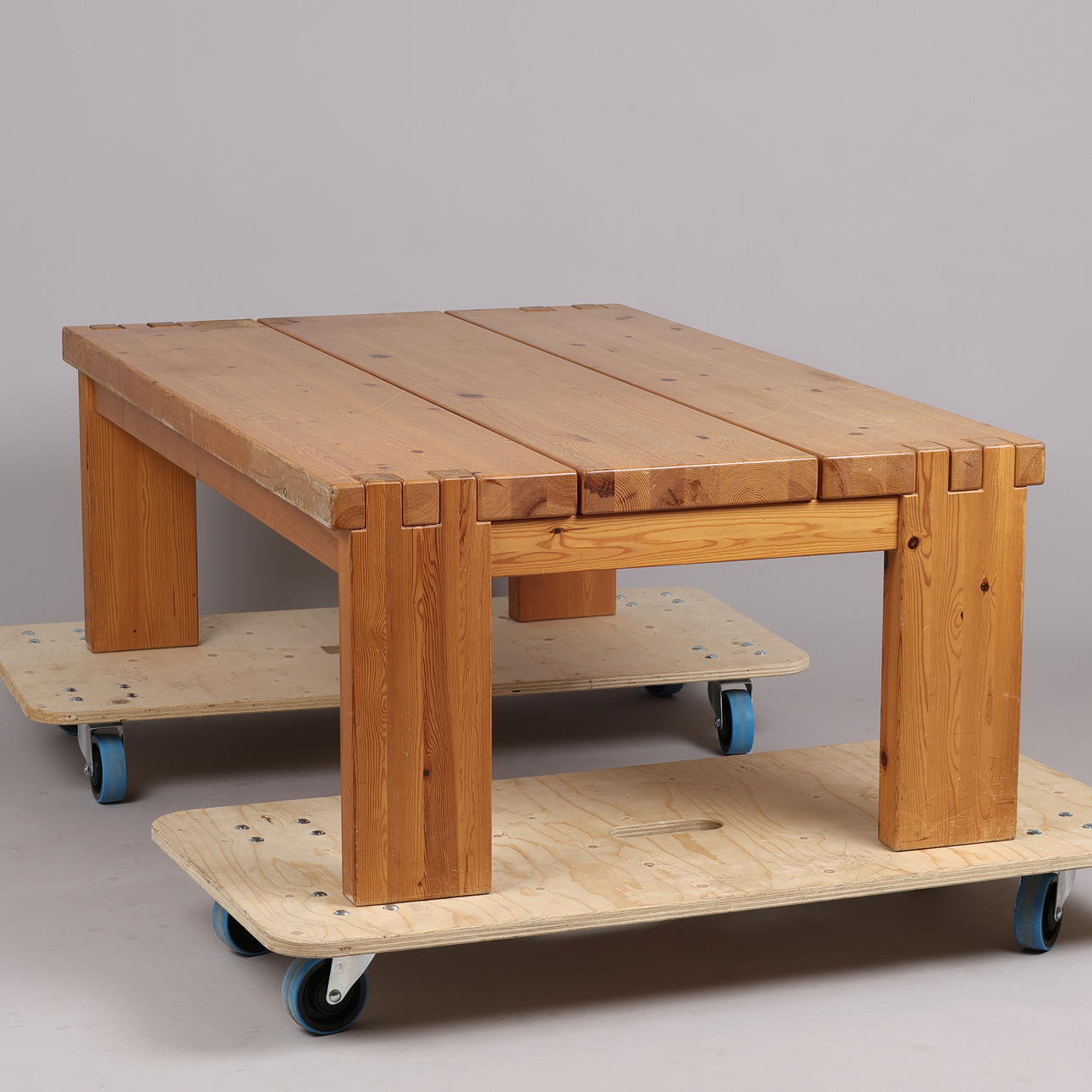 Rectangular coffee table made of solid pine with tap joints.