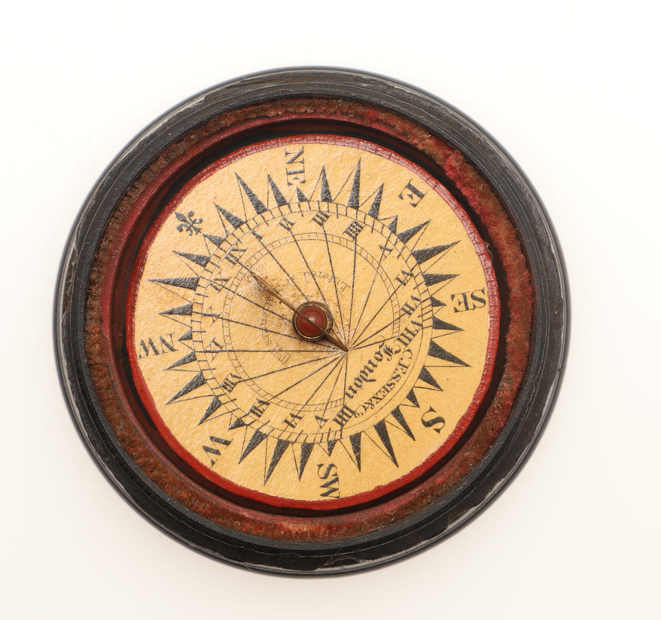 The circular card dial signed `C. Essex & Co, London`, and 'Entered at Stationers Hall, with raised gilt brass gnomon and central cabochon balance stone, contained in a turned ebony case with screw-on lid,