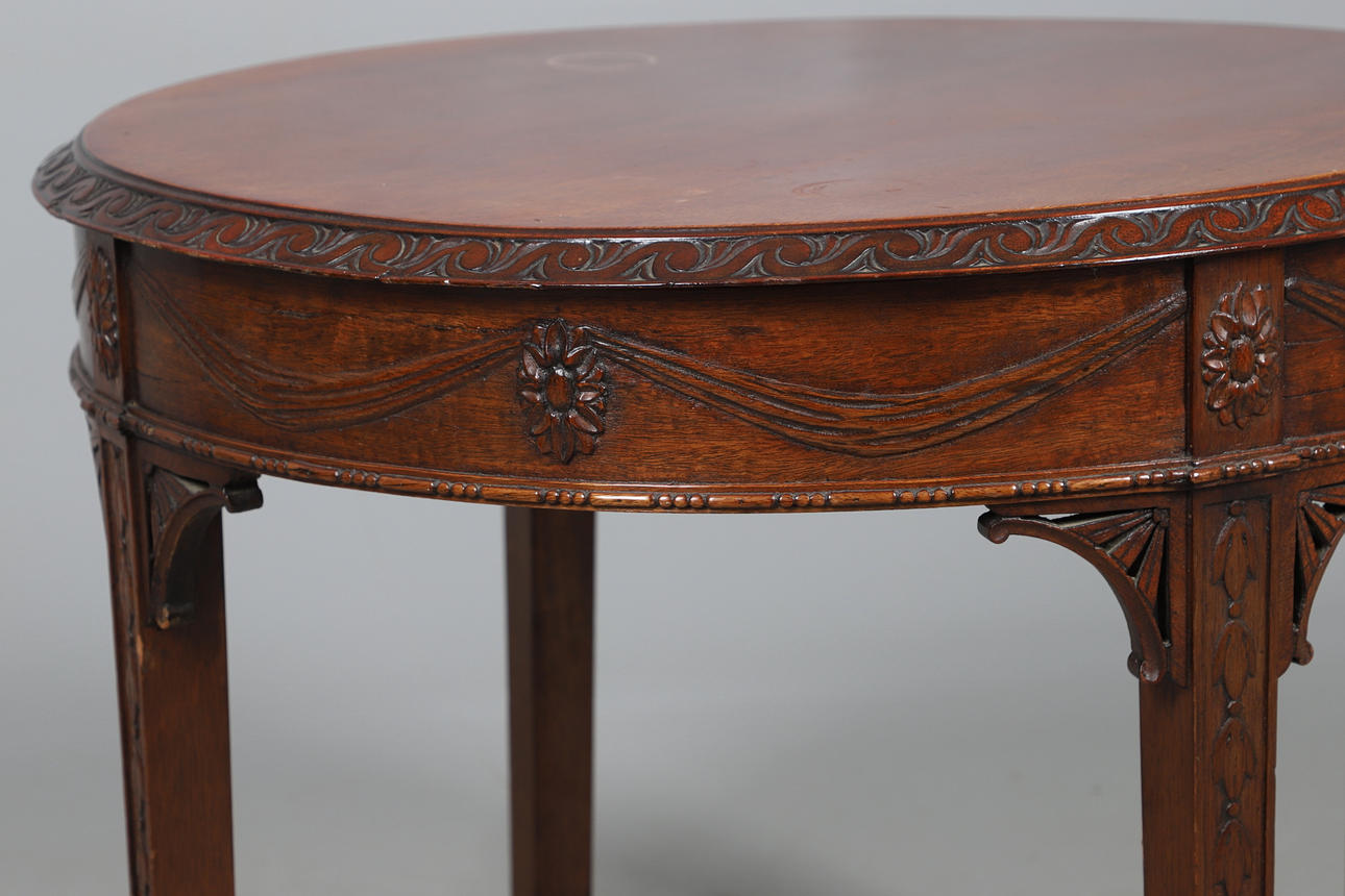 with carved and moulded foliate and wave decoration, all raised on spade feet, 61cm dia x 47cm high.