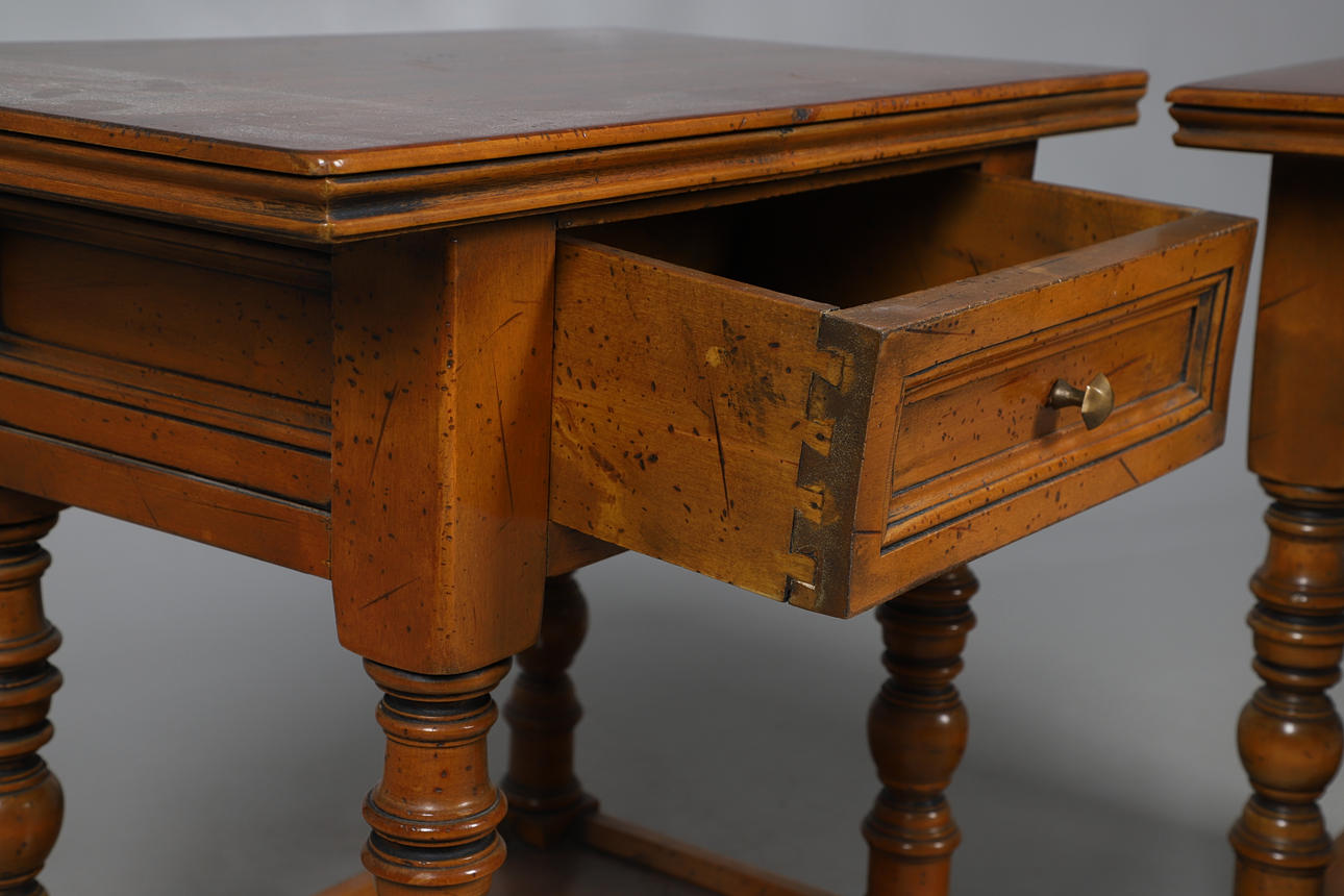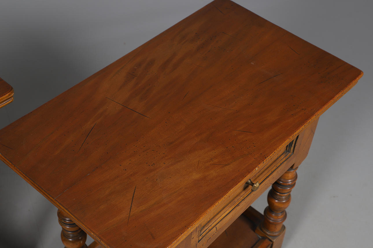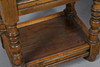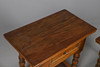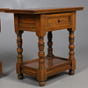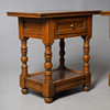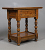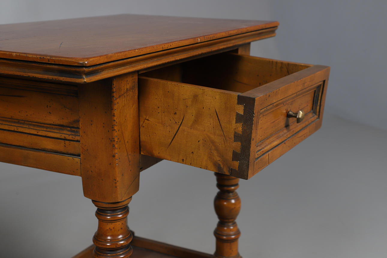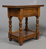With singular drawer, on turned stretchers and shelf underneath. Height 59cm, width 60cm, depth 36cm.