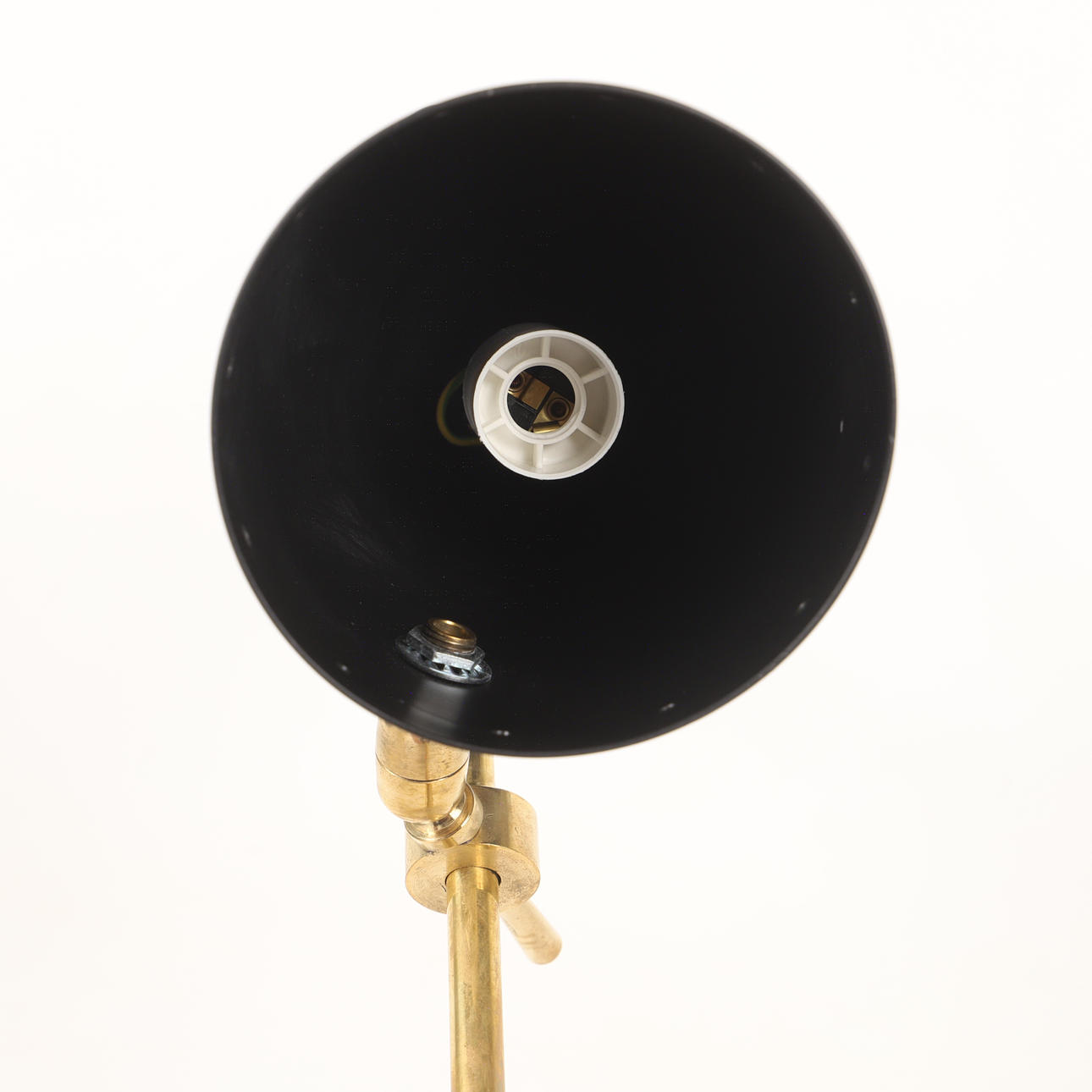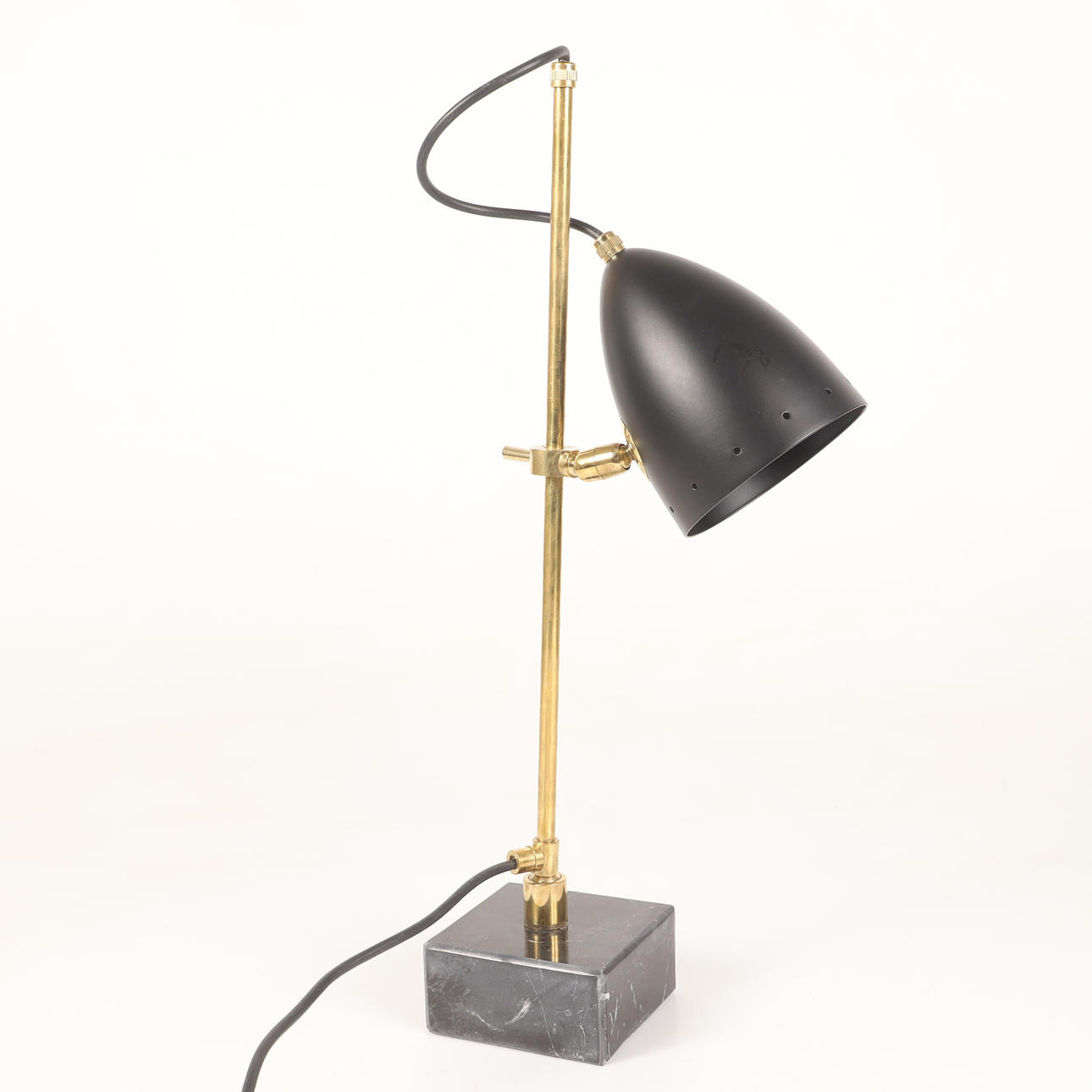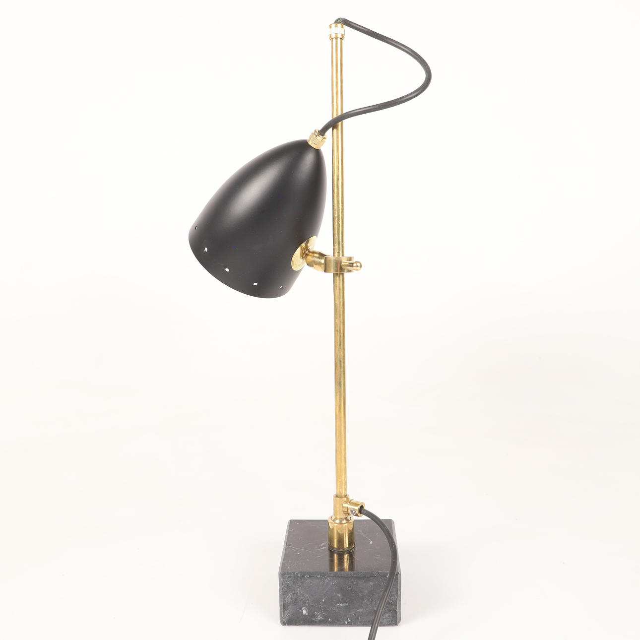 Frame of patinated brass, black lacquered metal screen, square base of black marble