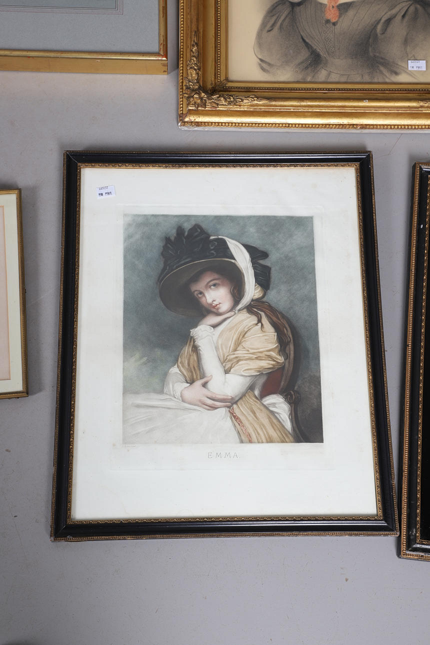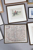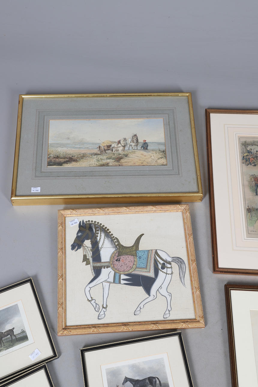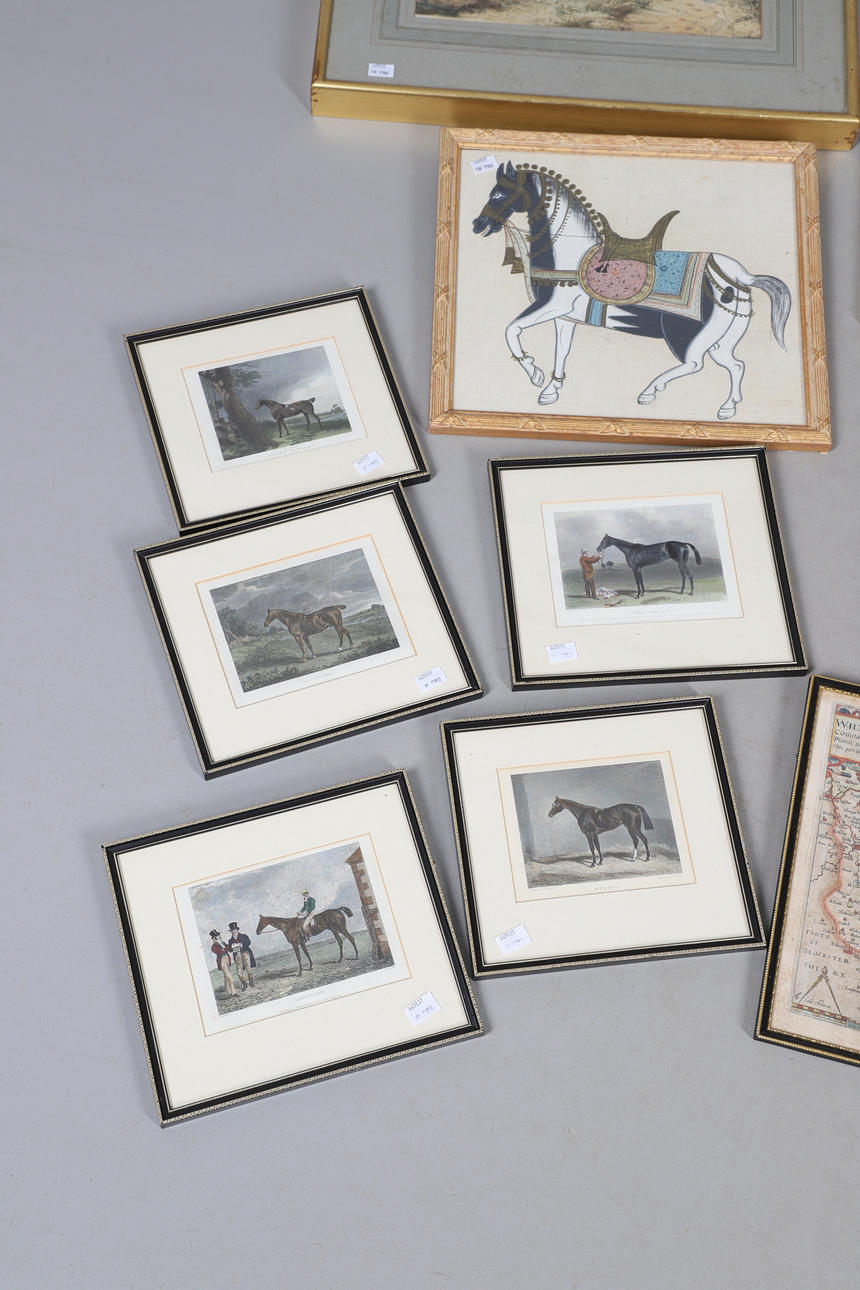 Framed map of Wiltshire (overall 41x33cm), together with various other prints (mainly horse related) and two watercolours.