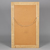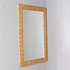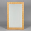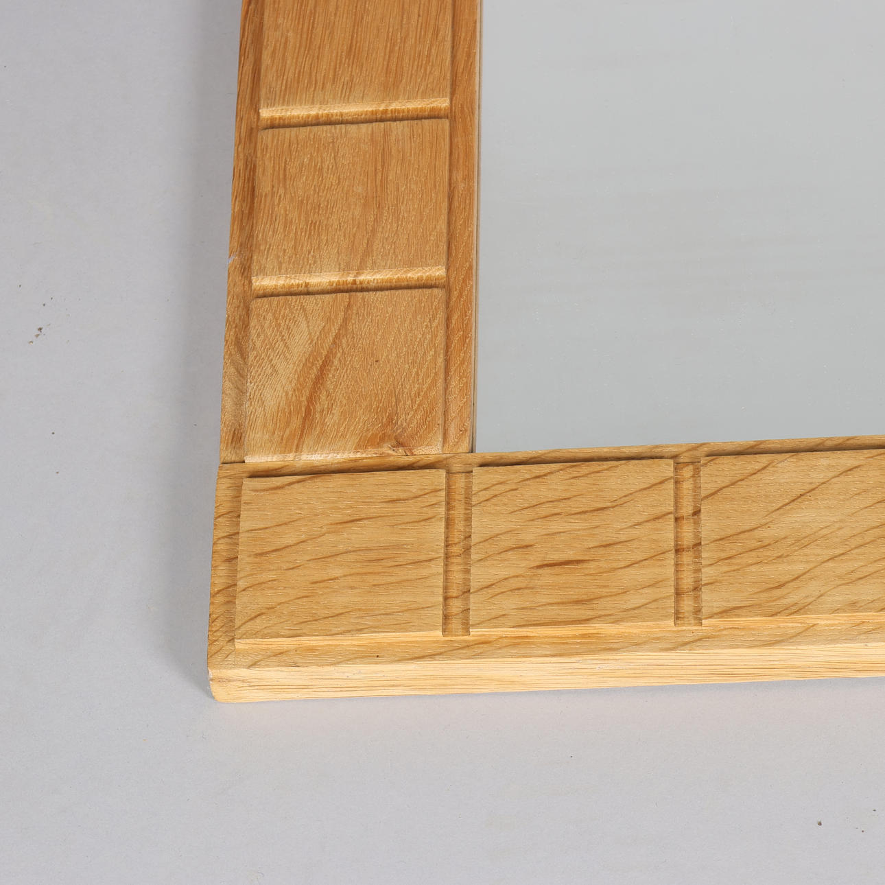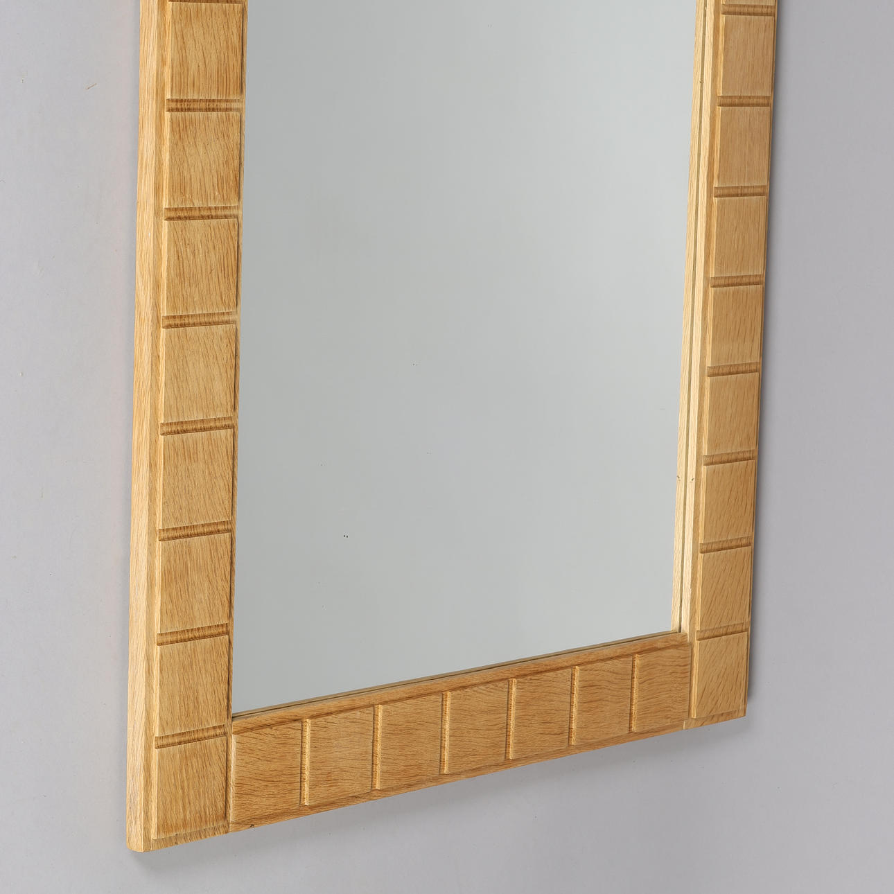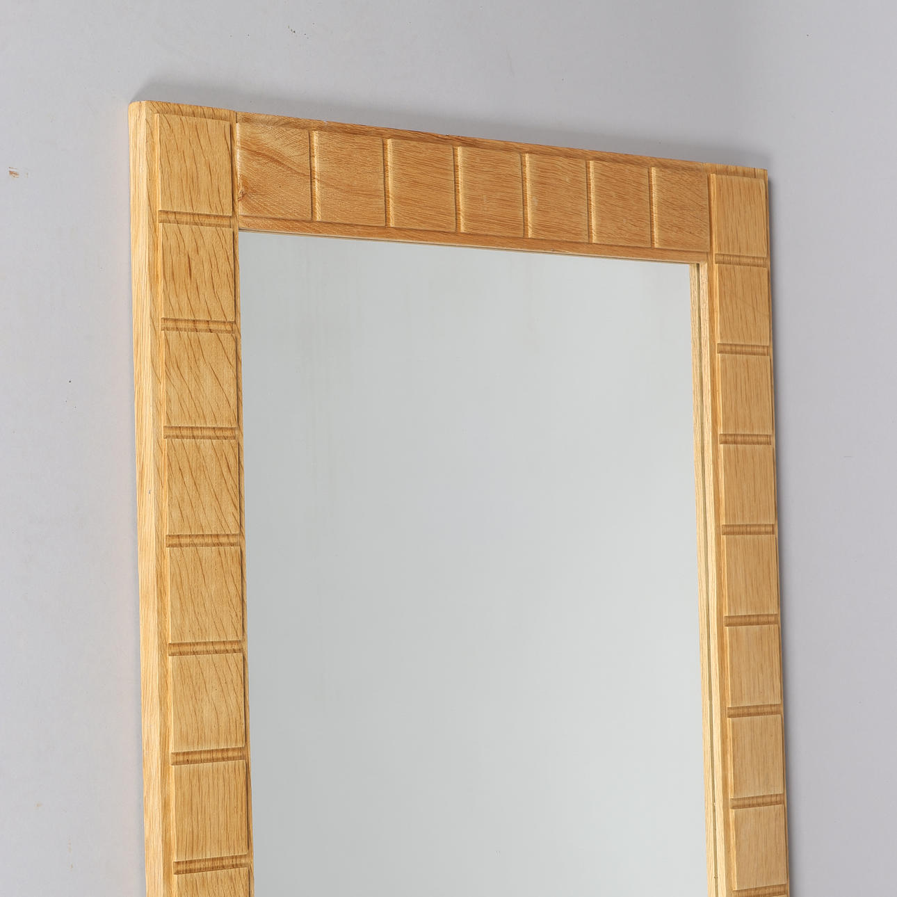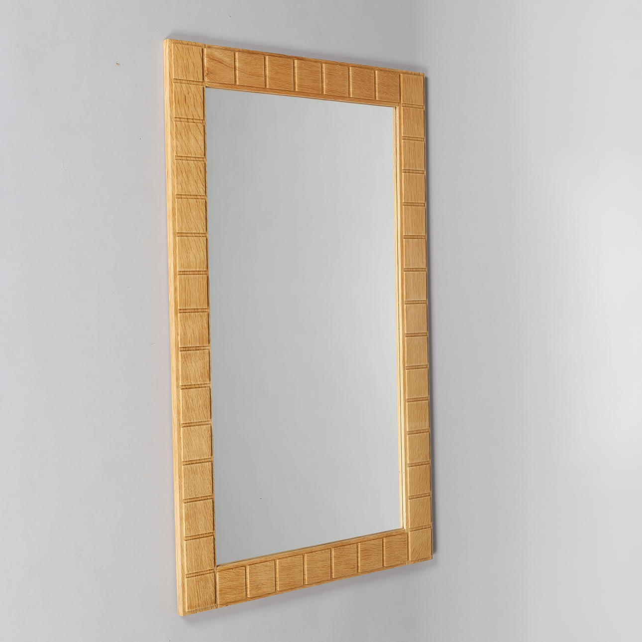 Rectangular, wall-hung mirror with solid oak frame carved in square relief.