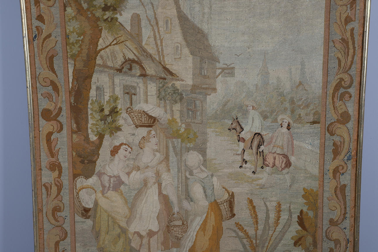 Of large size, designed with a variety of figures in a village scene within a shaped panel, with foliate decoration in a border around the rim and in a wooden frame, 204cms high, 121cms across.