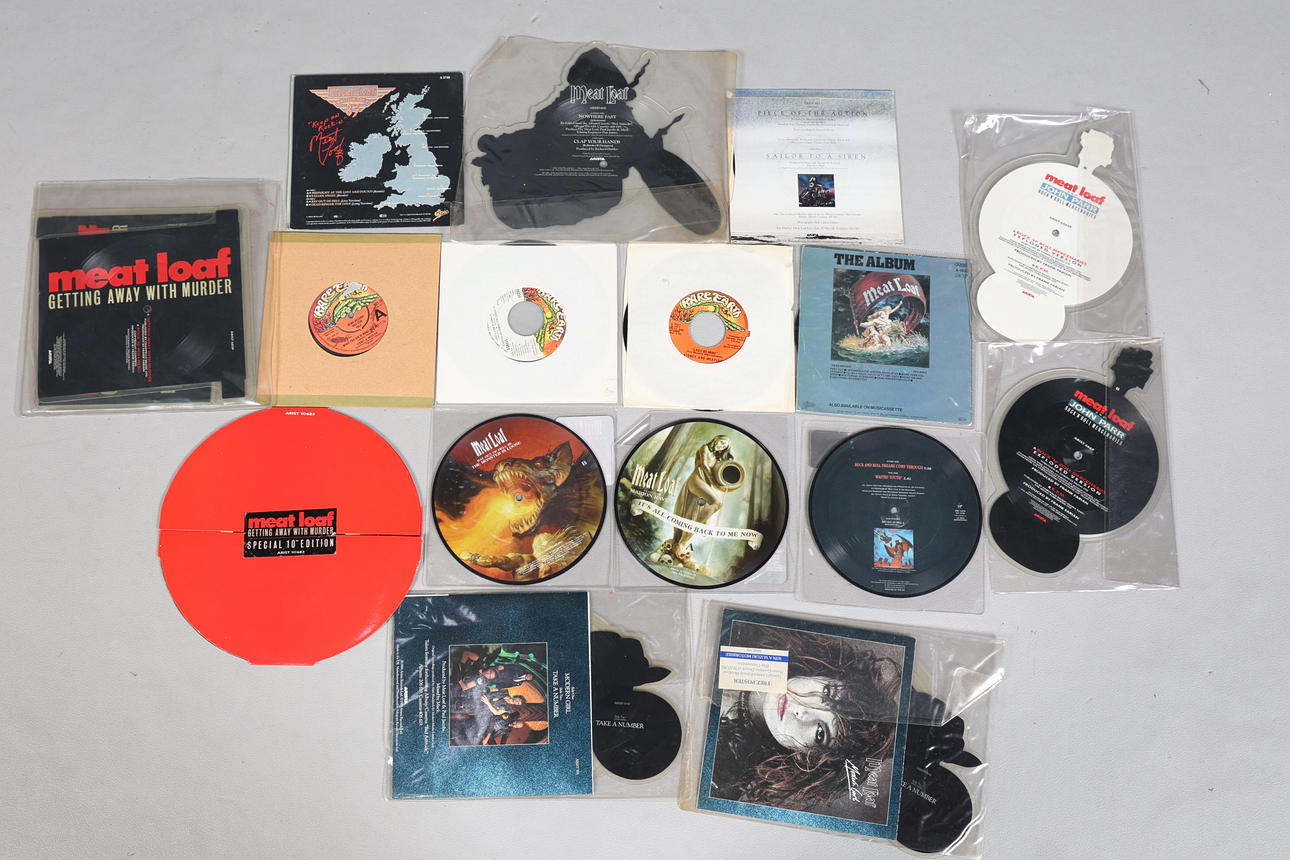 Various Meat Loaf 7" singles and picture discs to include What You See Is What You Get (RES 103, promo), Rock And Roll Dreams/ Wasted Youth (VSP 1479), It's All Coming Back To Me Now (1707713), Cry Over Me (1733478), Getting Away With Murder (Scott Free Mix) (ARIST 10683), Nowhere Fast (ARISD 600), Modern Girl (x2) (ARISD 585, with poster), Rock'n'Roll Mercenaries (x2) (ARIST 666XP & ARIST 666P) and Getting Away With Murder (ARIST 683P). (qty).