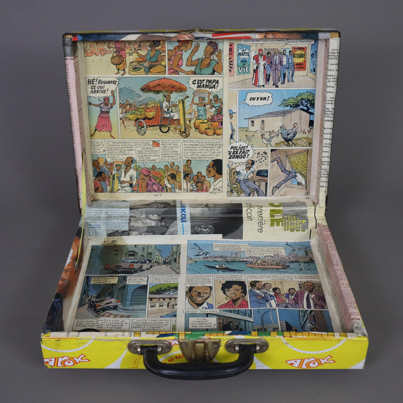 Polychrome-printed sheet metal coating with advertising motifs (tuna cans from the company “Arok” (?)), covered with comic book pages on the inside, H.xb.xt. cca 9 x 36 x 26 cm.