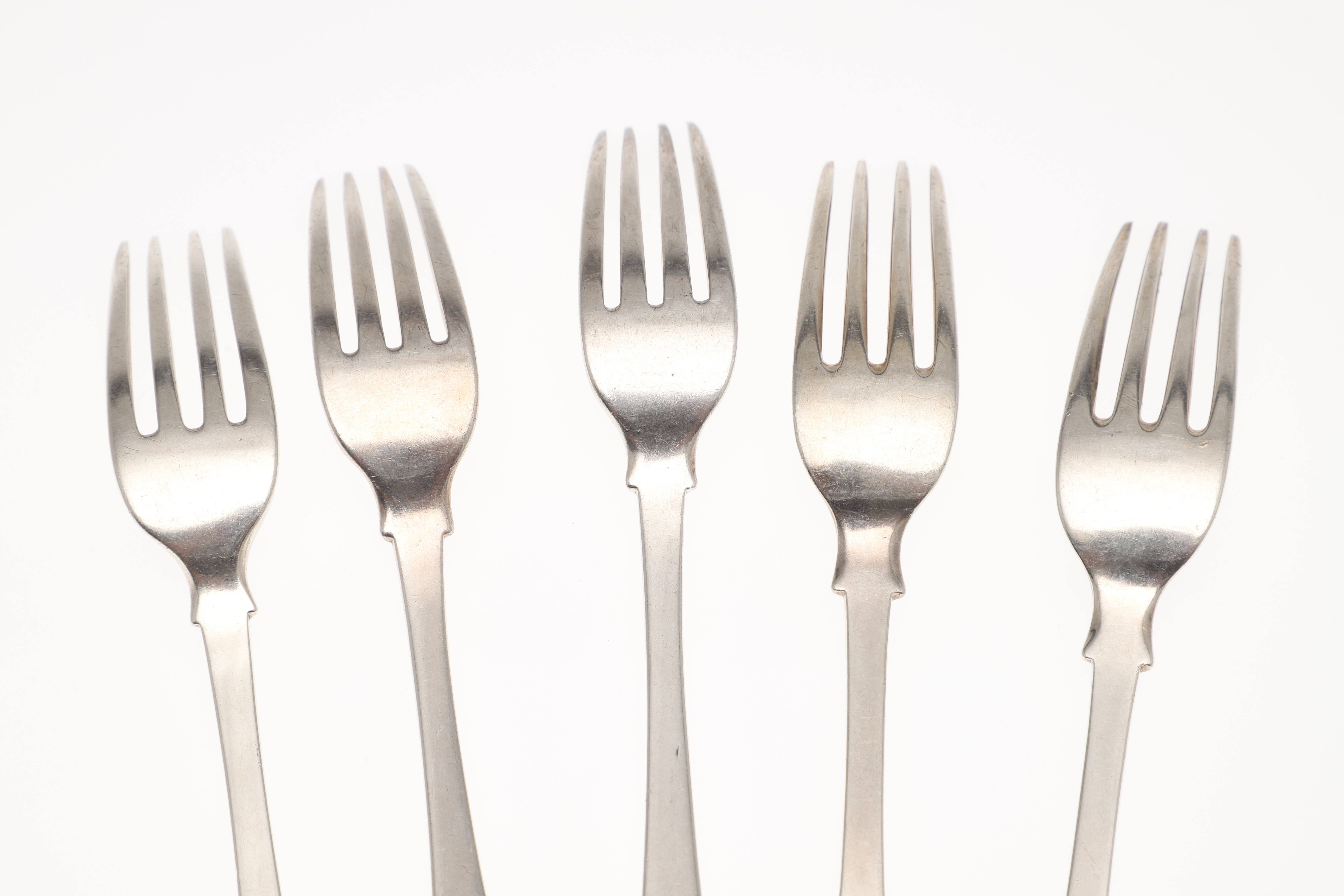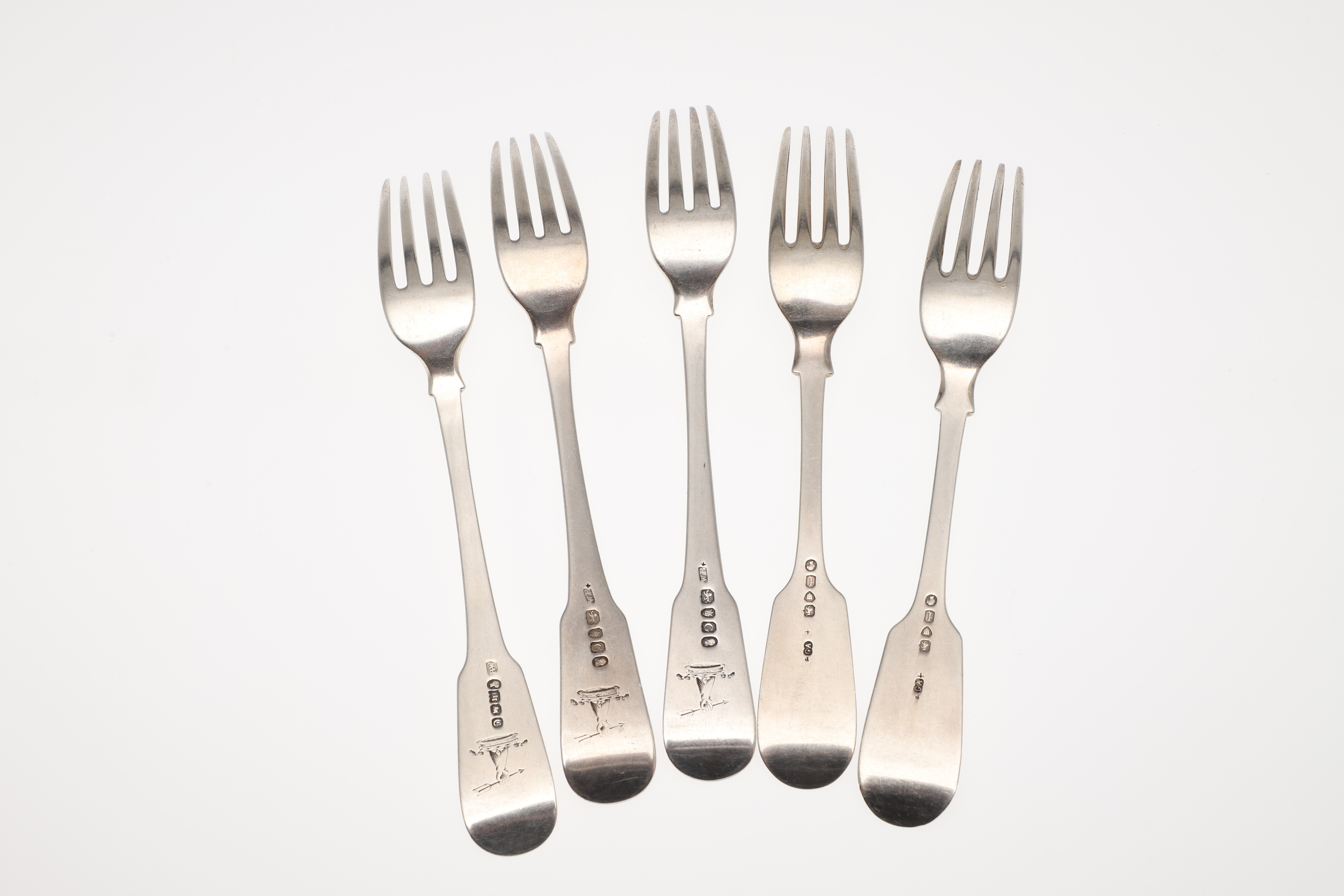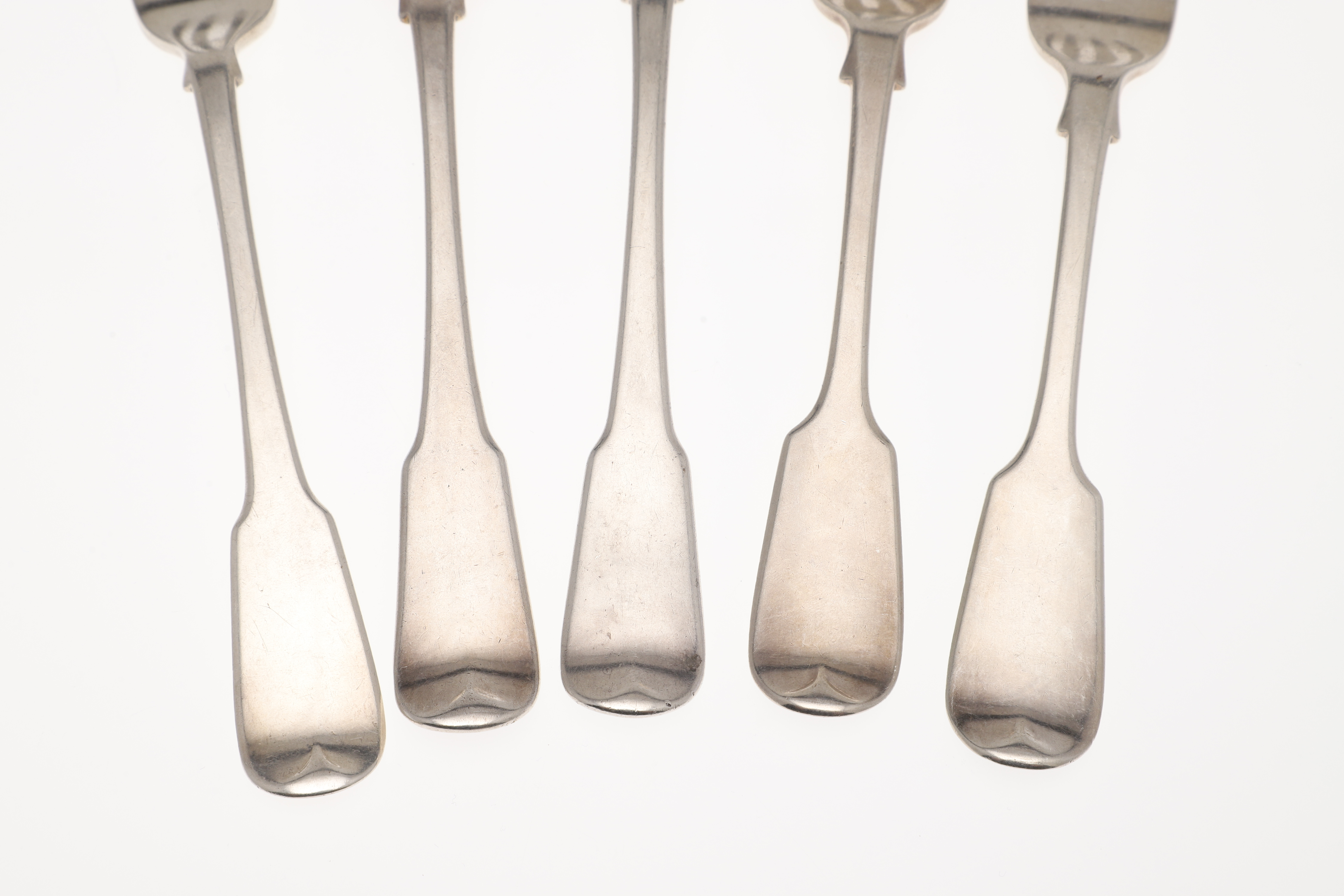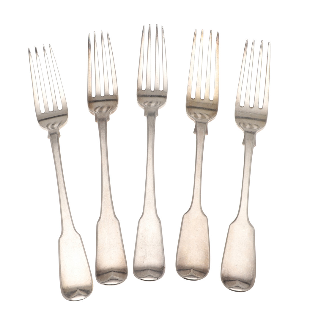 4420433. FIVE 19TH CENTURY SILVER FIDDLE PATTERN TABLE FORKS.
