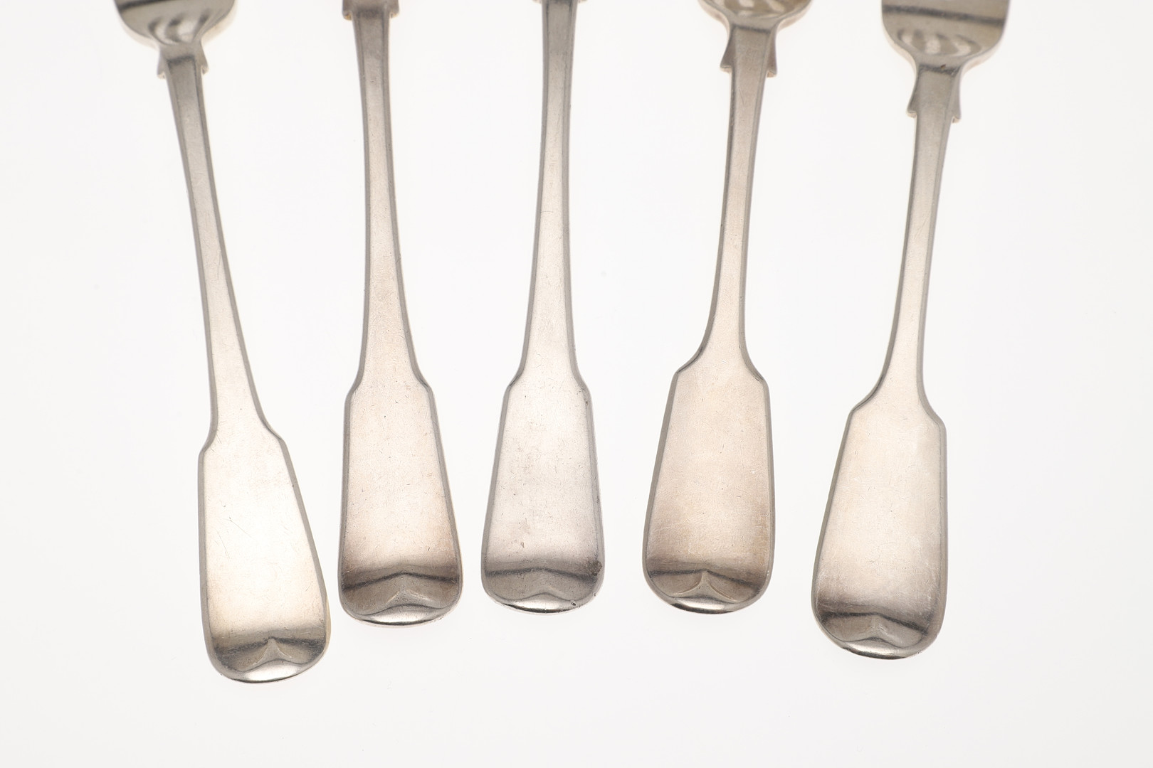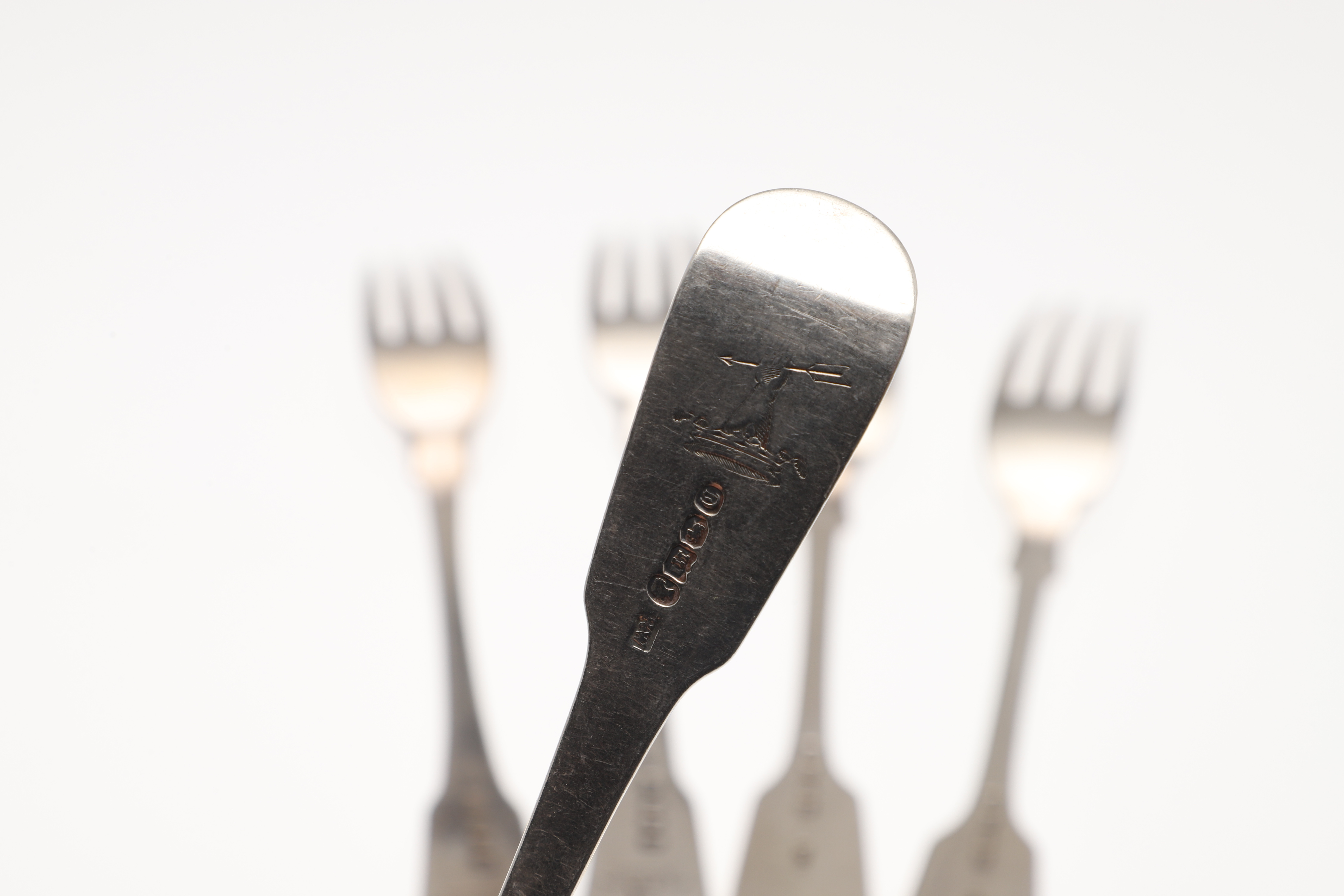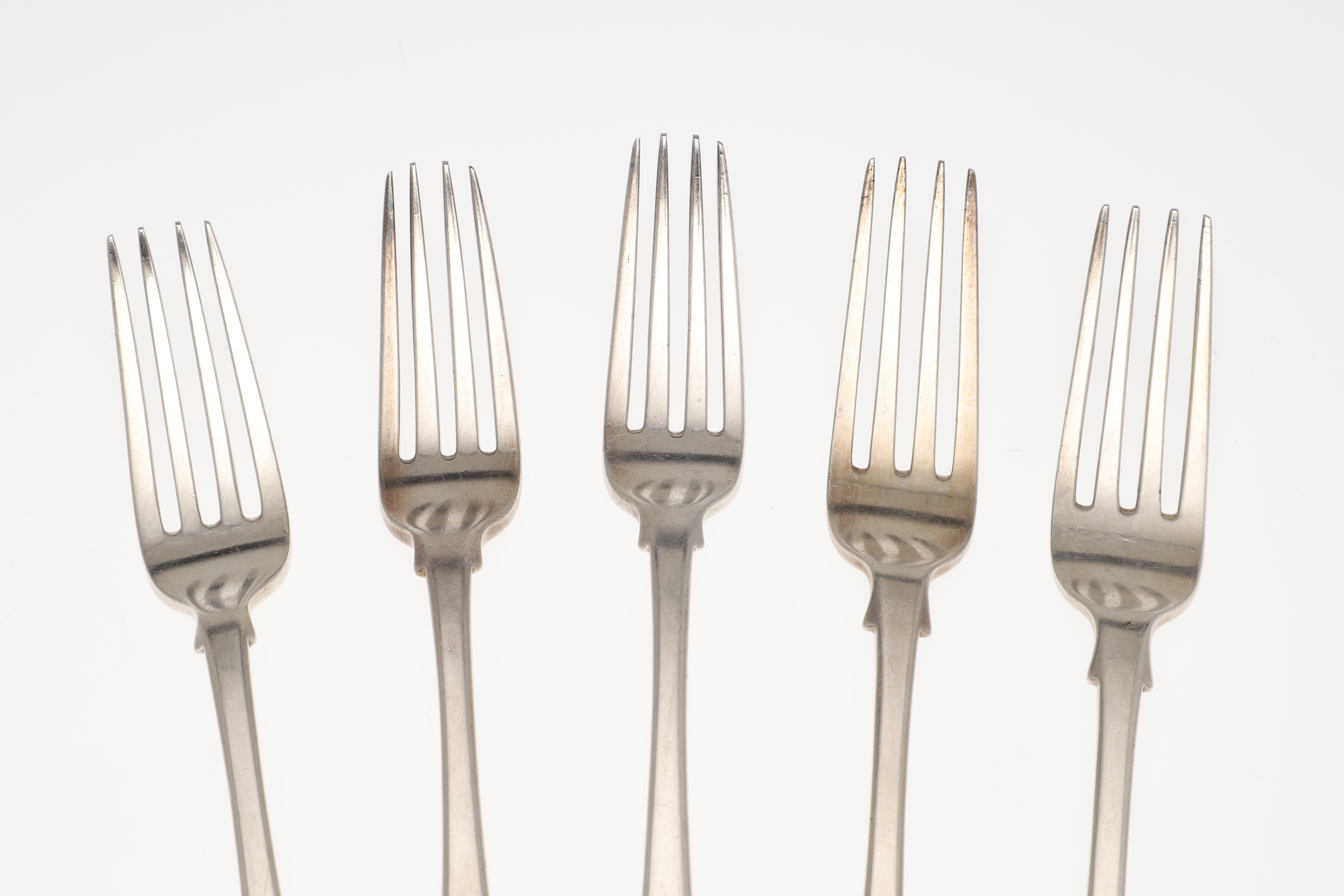 4420433. FIVE 19TH CENTURY SILVER FIDDLE PATTERN TABLE FORKS.