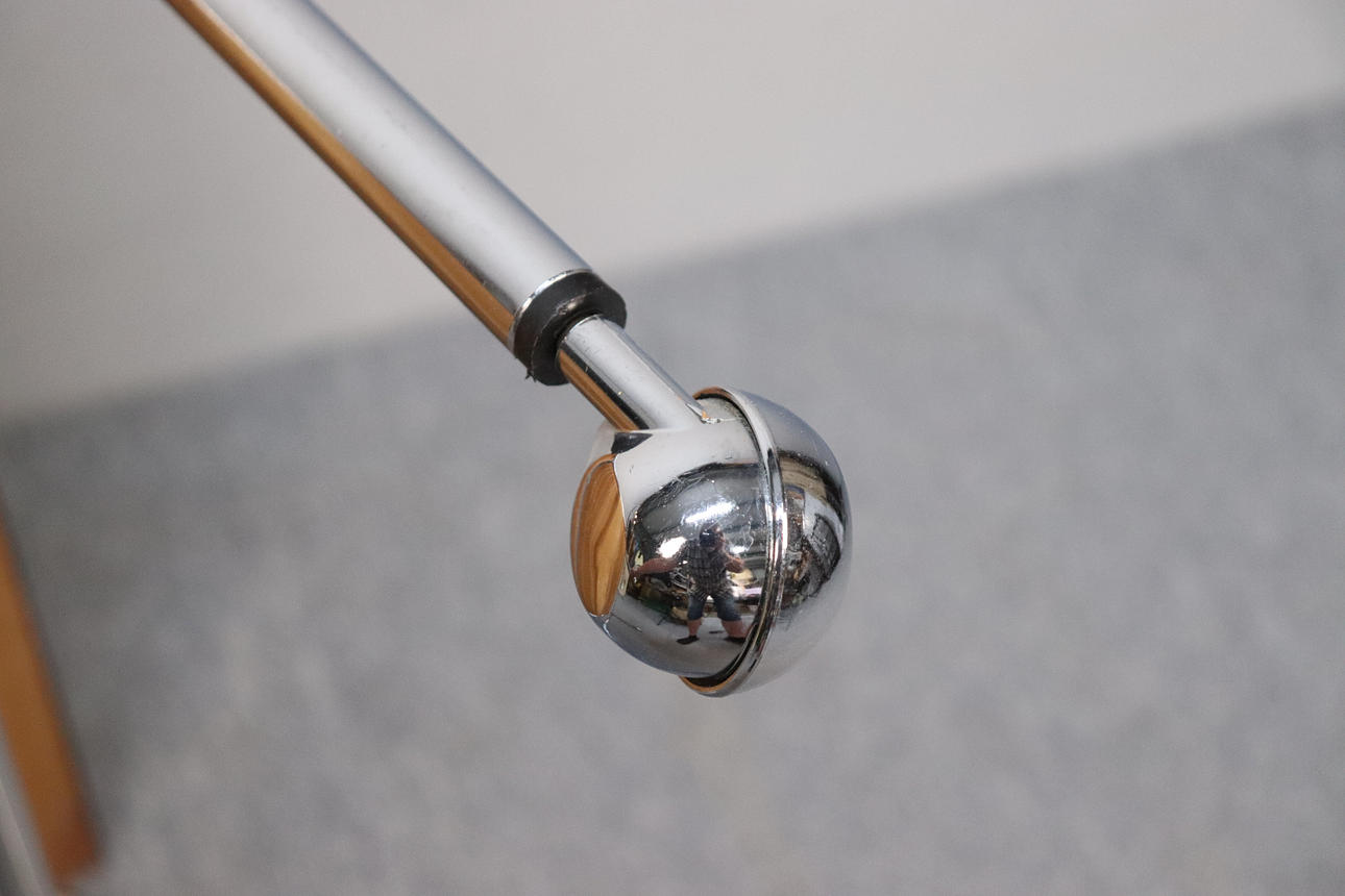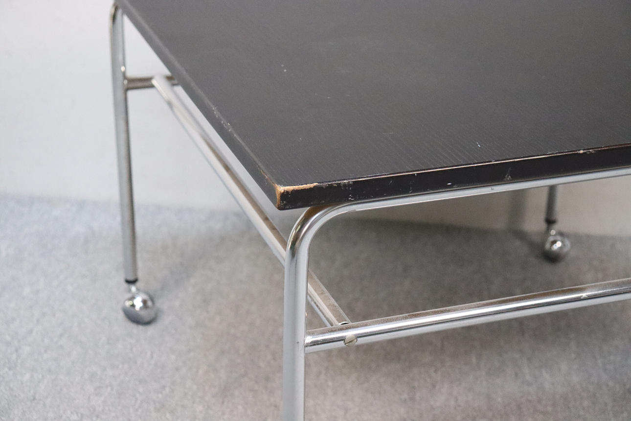 Frame in chromed steel tubes with wheel lace ends, table top in black lacquered ash veneer, model designed in 1971.