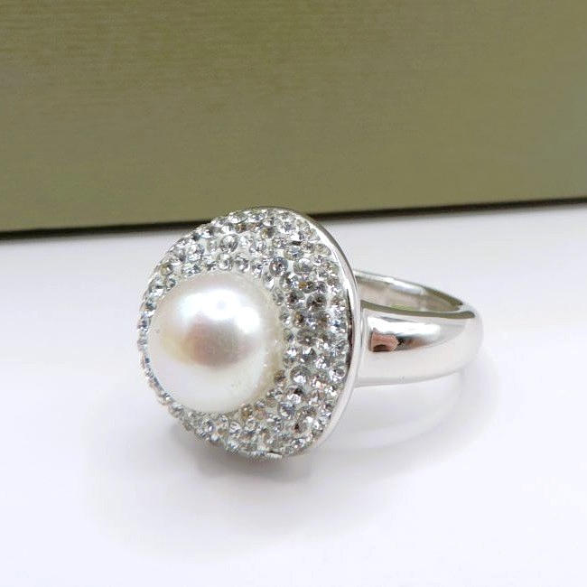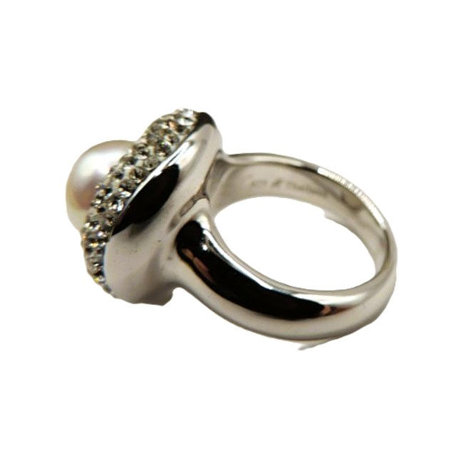 A Sterling silver Honora Collection cultured pearl ring set with a 10mm pearl and a halo of crystals. Ring size S. New unworn in original gift box and pouch.