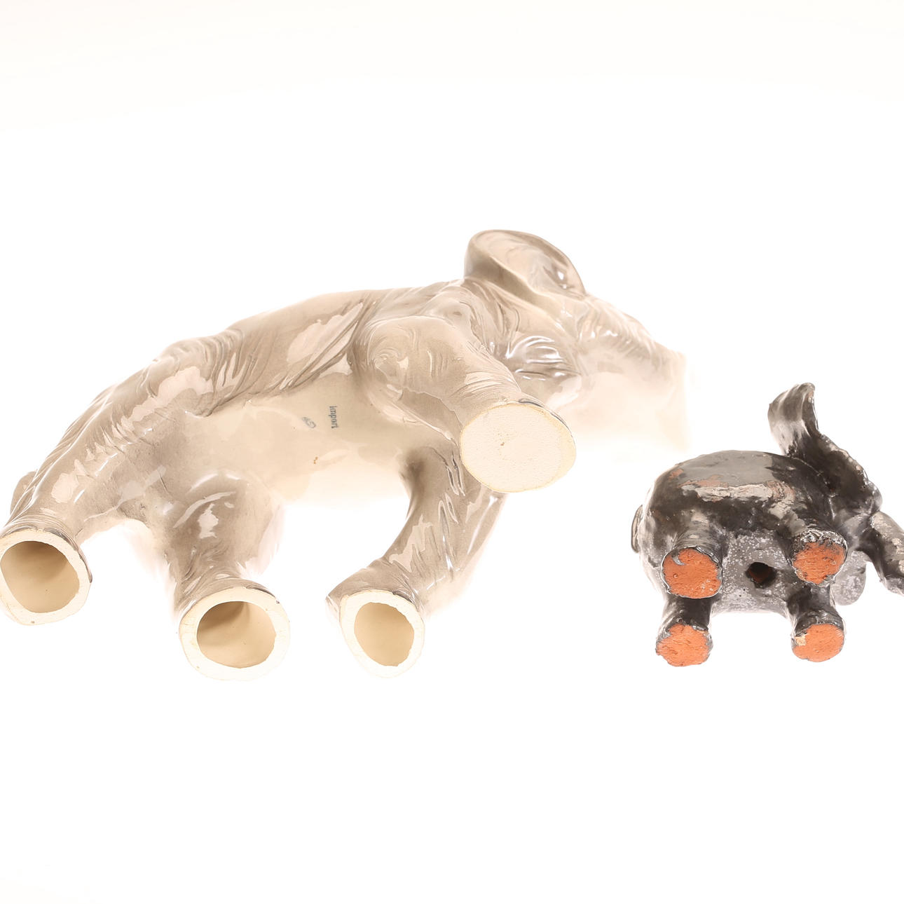 The large one marked with import, height about 25 cm, length about 32 cm. The small, unmarked, height approx. 10.5 cm, length approx. 12 cm.