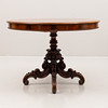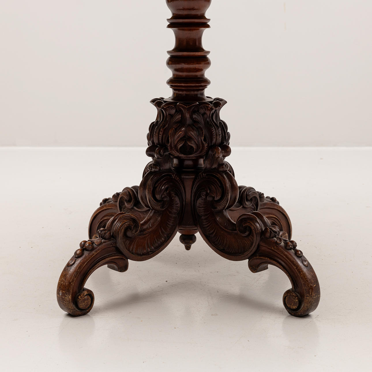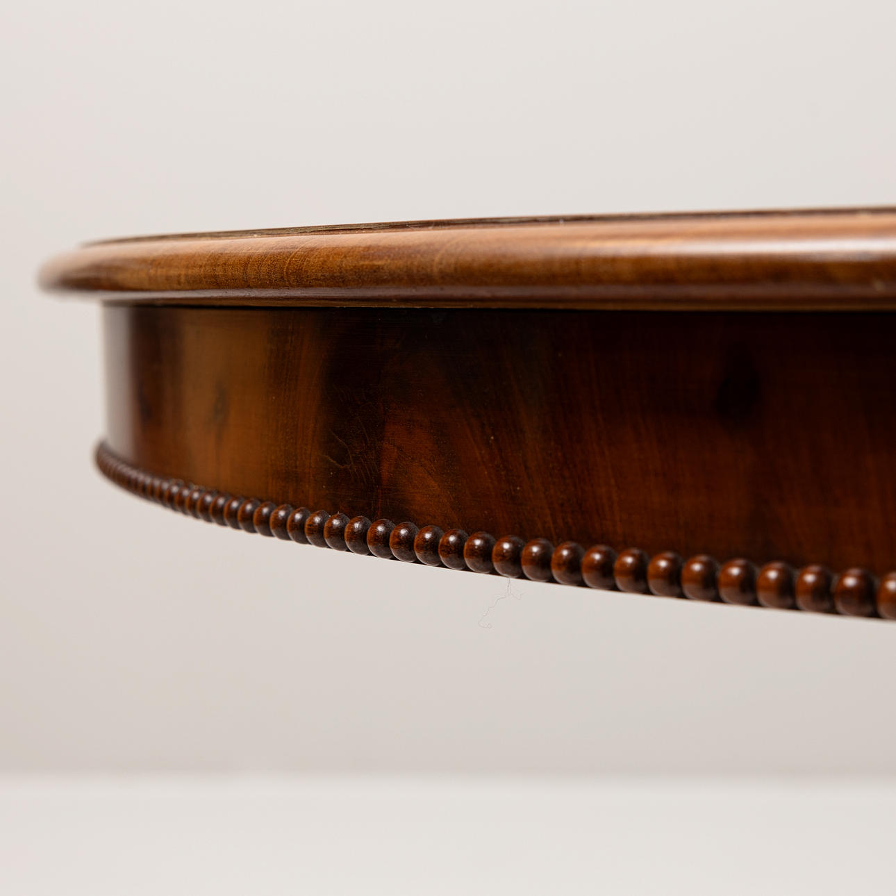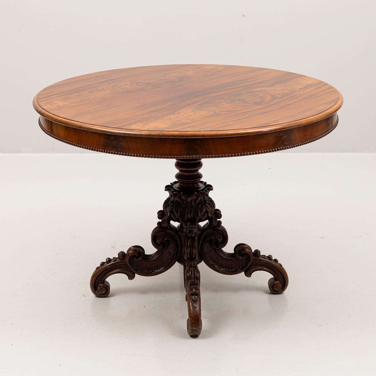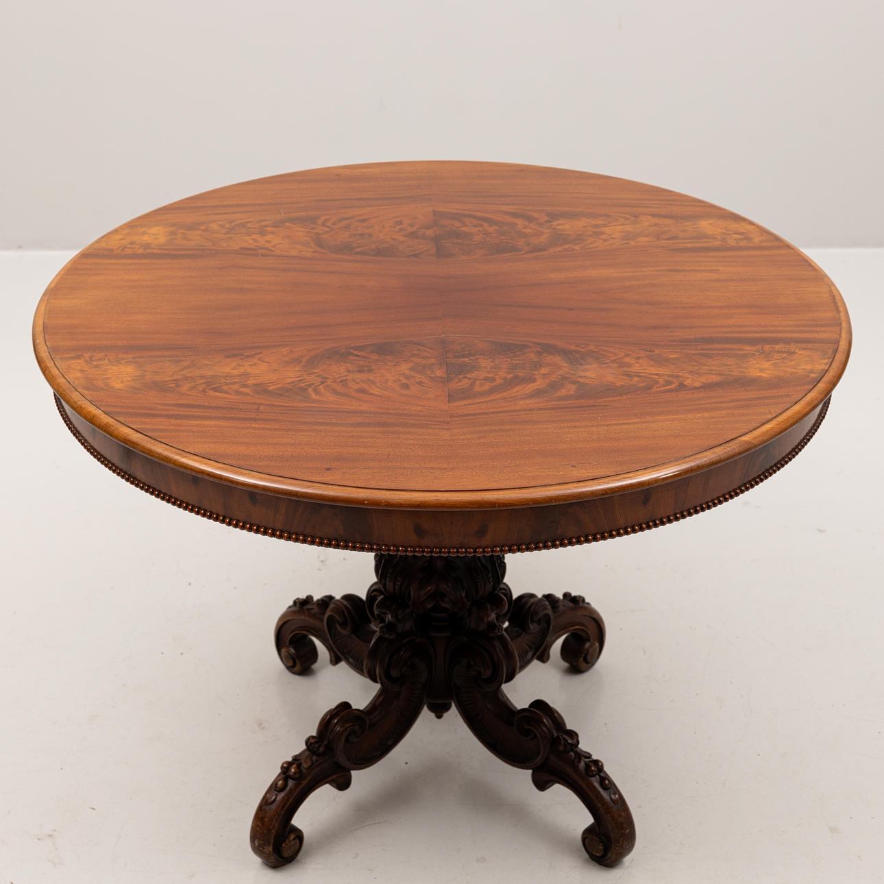 Abundantly sculpted foot round profiled disc with beaded decor. Diameter 102, height 74 cm.