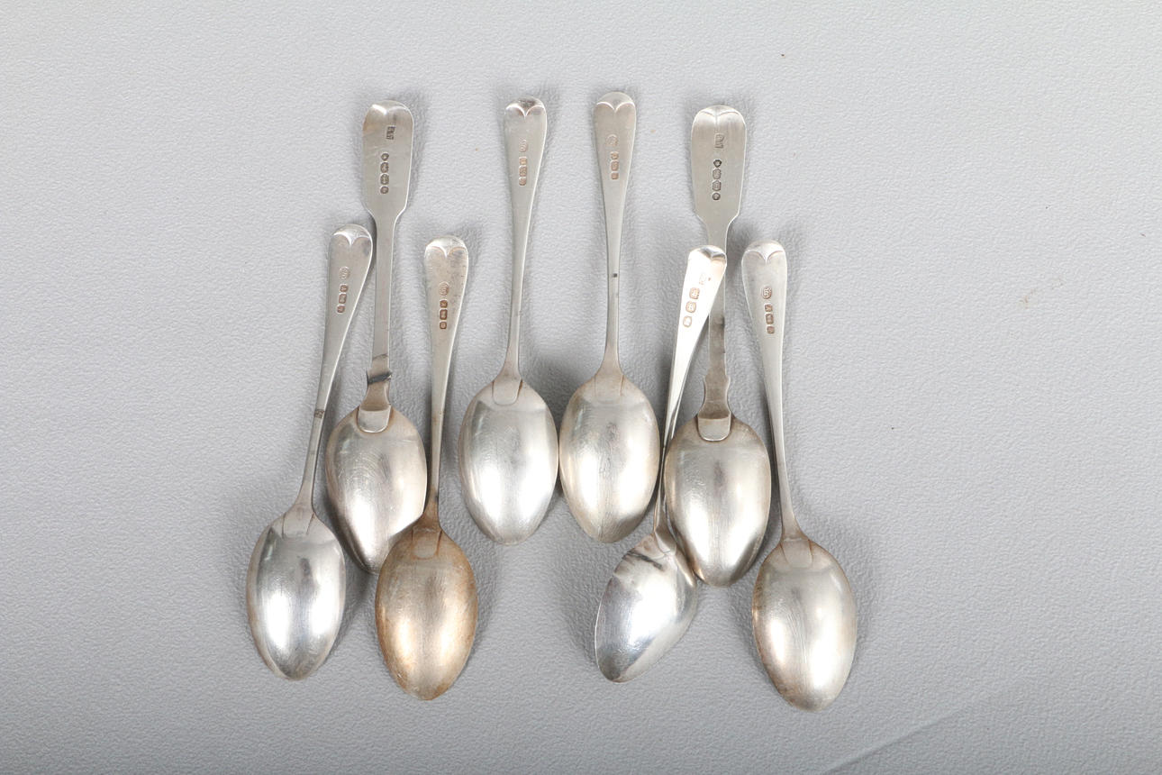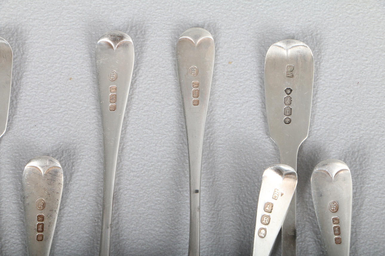 all of pain form with engraved crest handles, five by Joseph Rodgers, Sheffield 1891,two others by Samuel Whitford, London 1864 and one further silver teaspoon, all approximately 13.5cm long, weight 4.65oz (8).