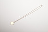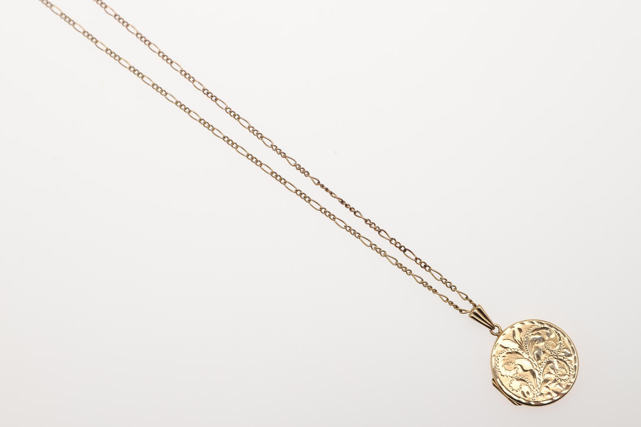 with engraved foliate decoration to the front case, 2cm dia., on a 9ct gold chain formed with long and short links, total weight 7.8 grams.