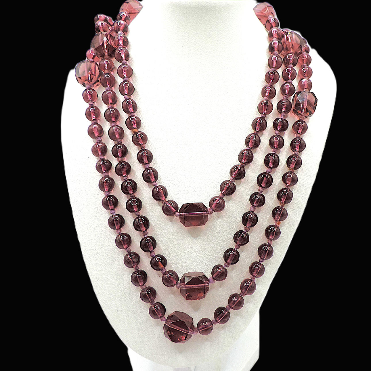 A fine quality 54 inch single strand dusky pink glass cube necklace. The round glass beads are 8mm and the larger oblong are 15x10mm and are hand knotted between each bead. A rare item of vintage jewellery in very good condition.
