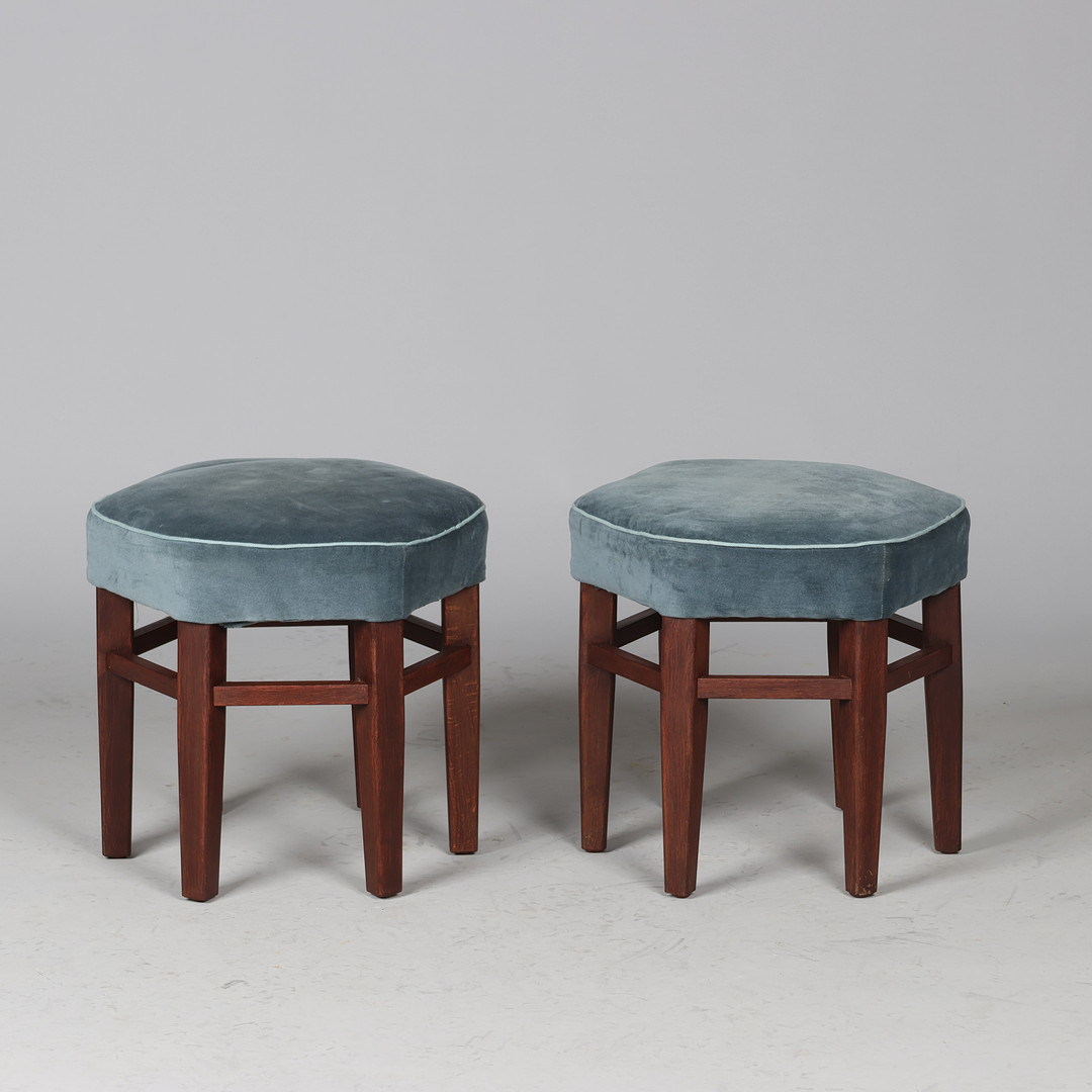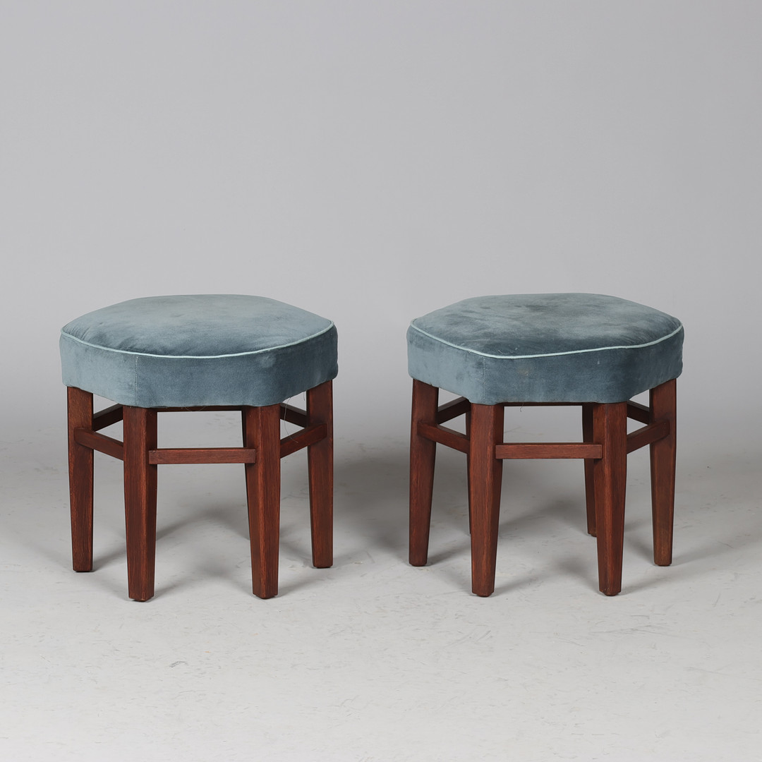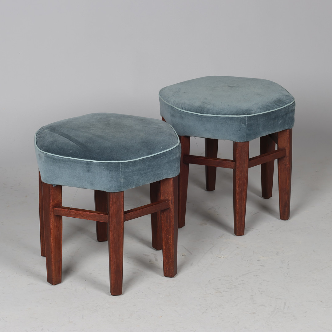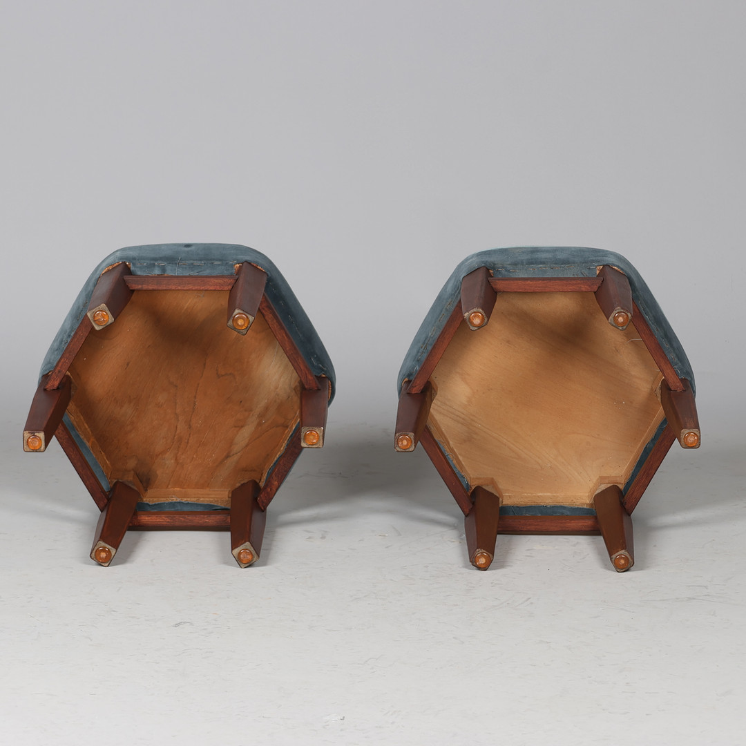 4423234. Danish cabinetmaker, a pair of hexagonal stools with blue upholstery and frame of dark-stained beech wood, Denmark, mid 20th century (2).