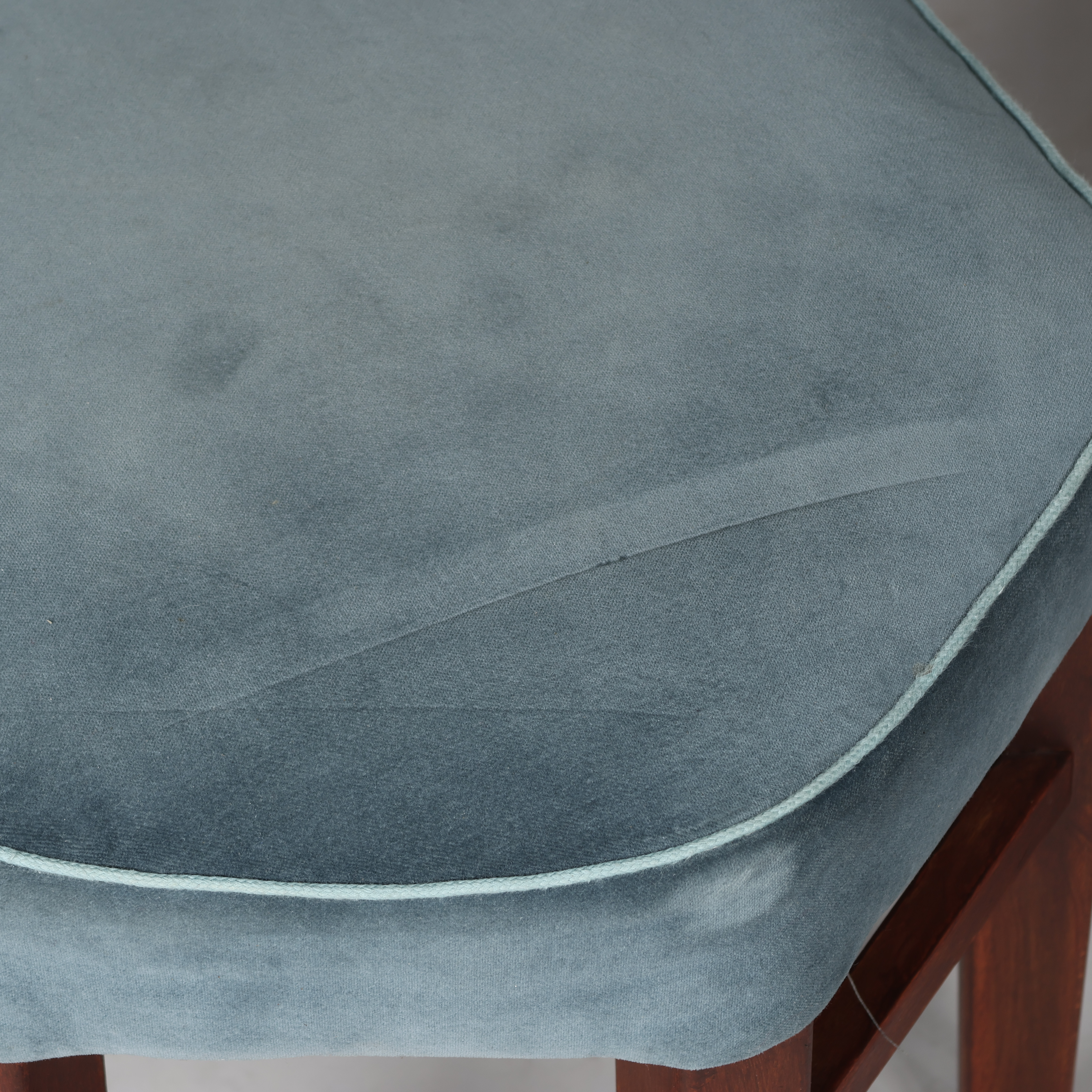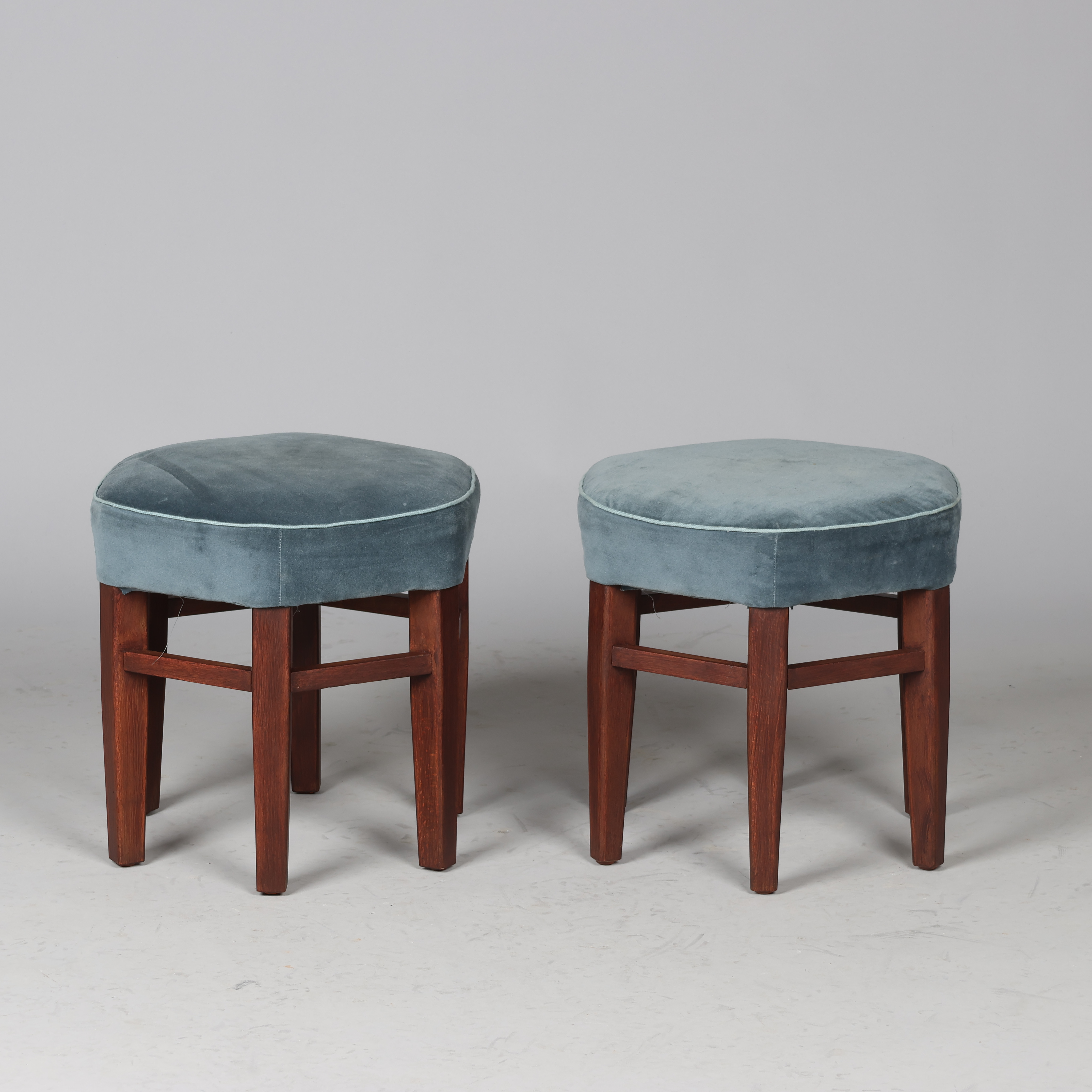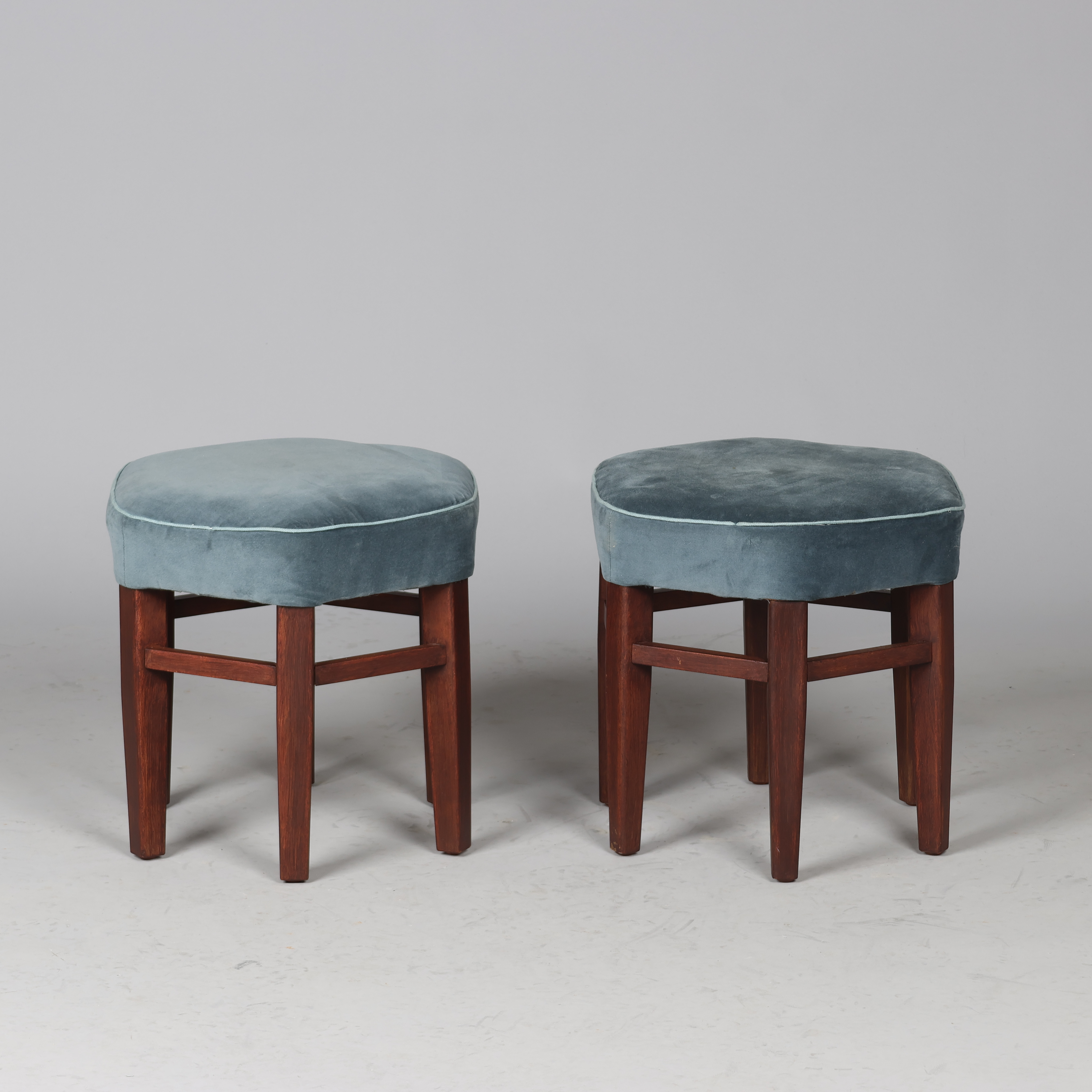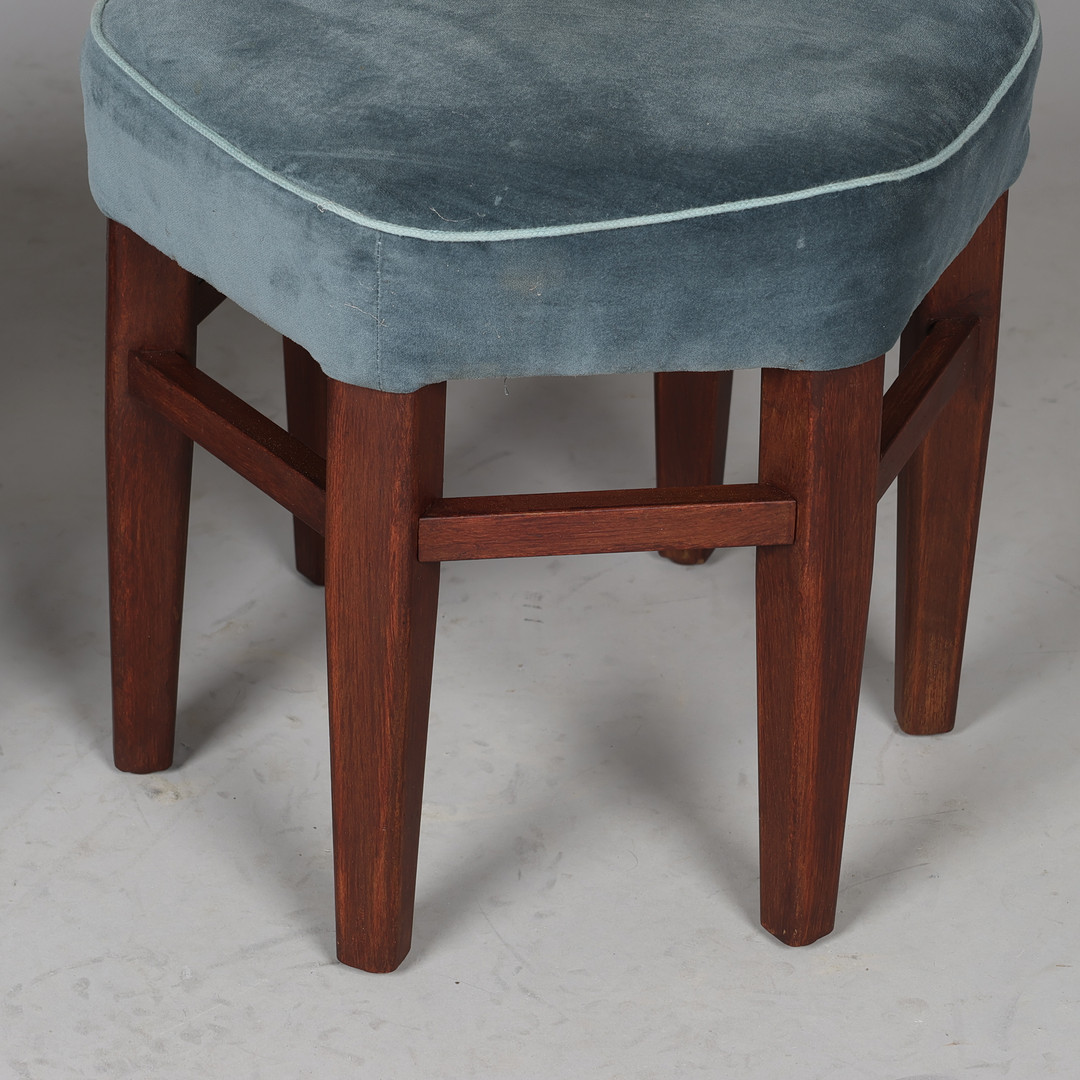 4423234. Danish cabinetmaker, a pair of hexagonal stools with blue upholstery and frame of dark-stained beech wood, Denmark, mid 20th century (2).