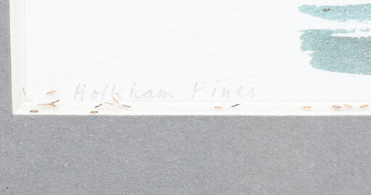 The watercolour titled 'Holkham Pines' and signed and dated 1928, framed and glazed, 38.5cm x 32cm including frame.