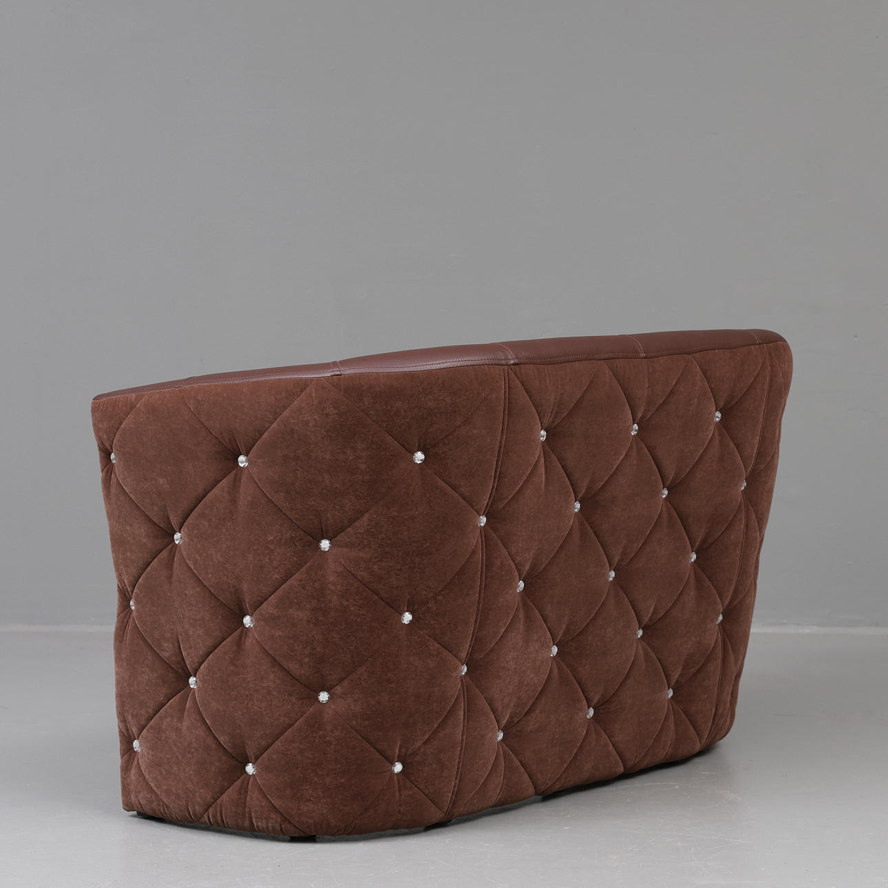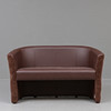 Two-seater sofa, fully upholstered, upholstered in artificial leather with a back piece in deep stitched textile. Labeled.