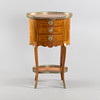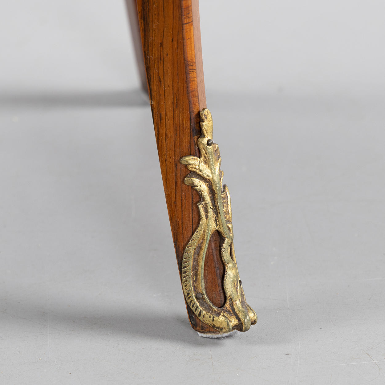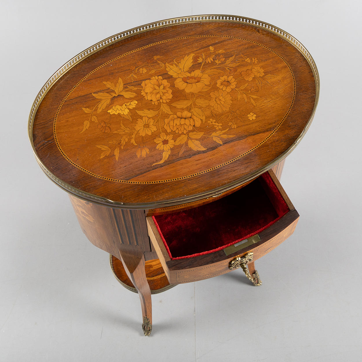 Veneered in mahogany, intarsia, brass grid edge, 3 drawers, height approx. 80, 49 x 35 cm.