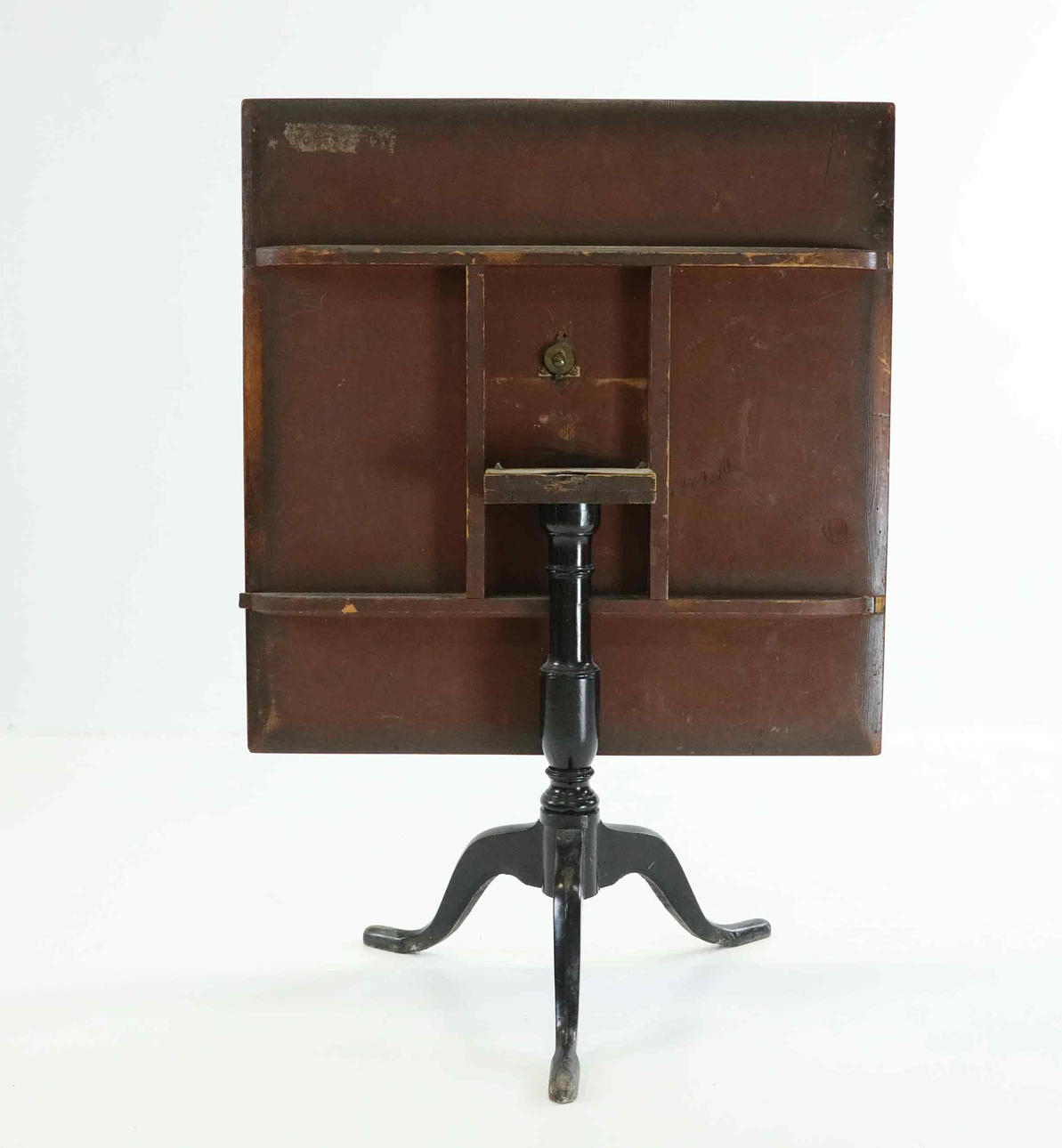 Disc veneered with root, blackened foot. Height 72 cm Table top approx 88x89 cm.