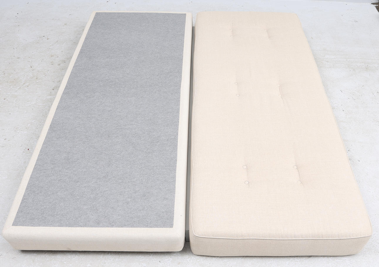 Condition of use. Surface dirt. Larger stain on one corner of the upper mattress.