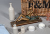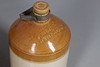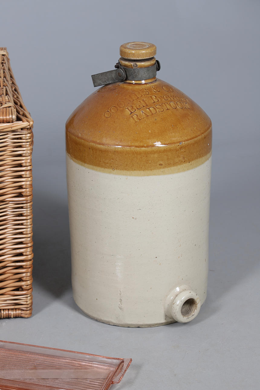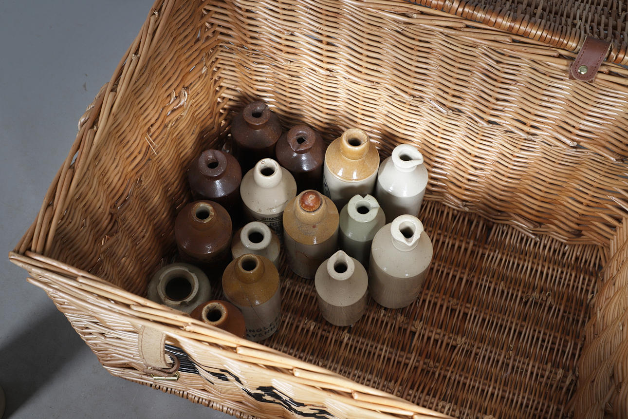 The Fortnum & Mason hamper features painted lettering "F & M" to the front, with leather securing straps and side wicker handles. Height 41cm, width 59cm, depth 40cm. Inside contains various stoneware jars and a gold painted figure of a woman. Also with a Coombs & Co Limd, Bell Brewery, Radstock large jar, height 48cm.