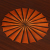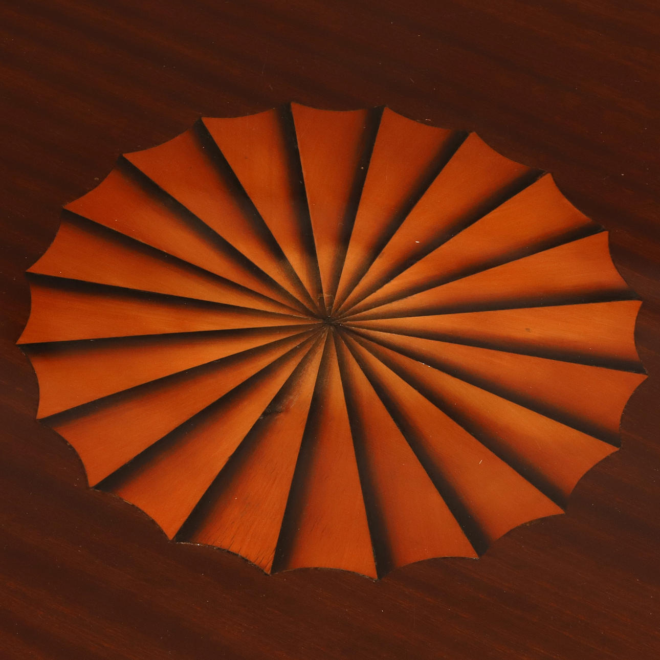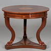 Round table on three-tiered pillar with intarsia in the form of fans. Legs with paw feet and brass details.