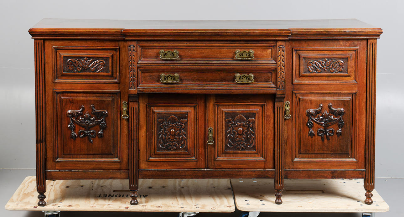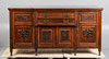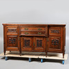 With two central drawers above two acanthus leaf and shell carved panelled doors, flanked by a further two acanthus leaf and scroll carved panel doors, the right hand cupboard with interior lined cellarette drawer, raised on turned feet, 182cm wide, 58cm deep max, 95cm high.