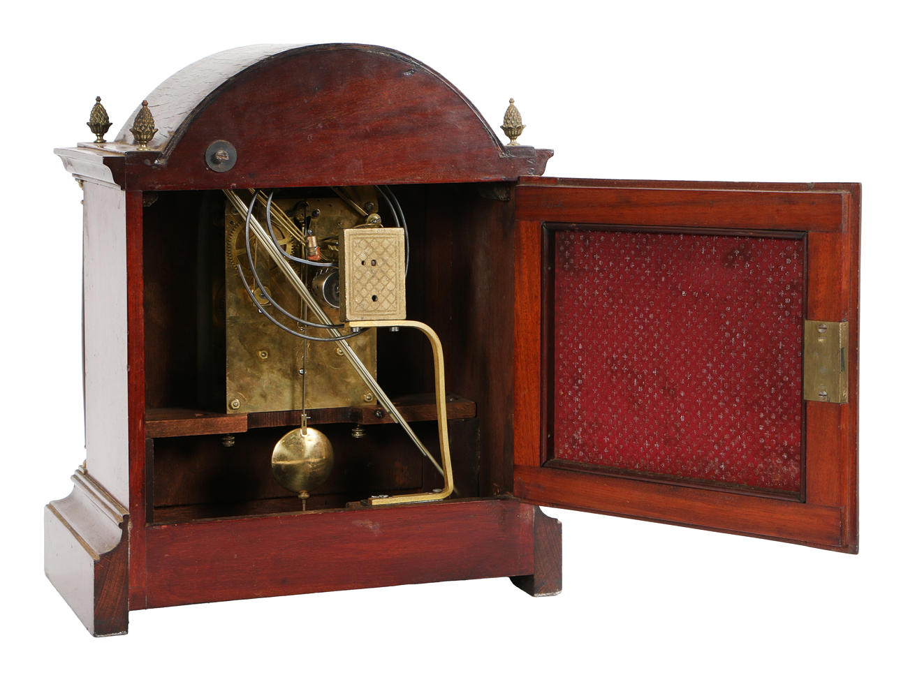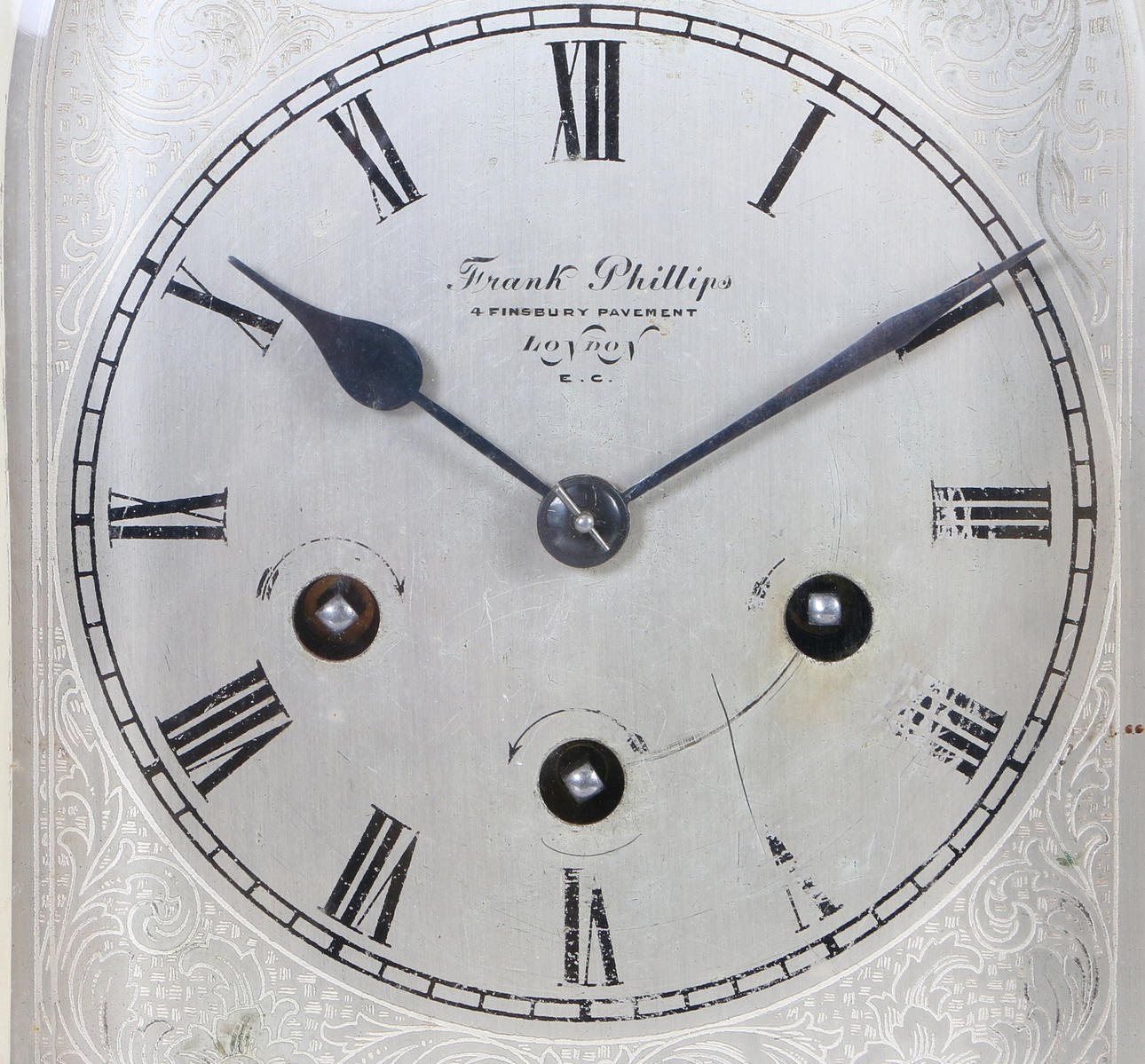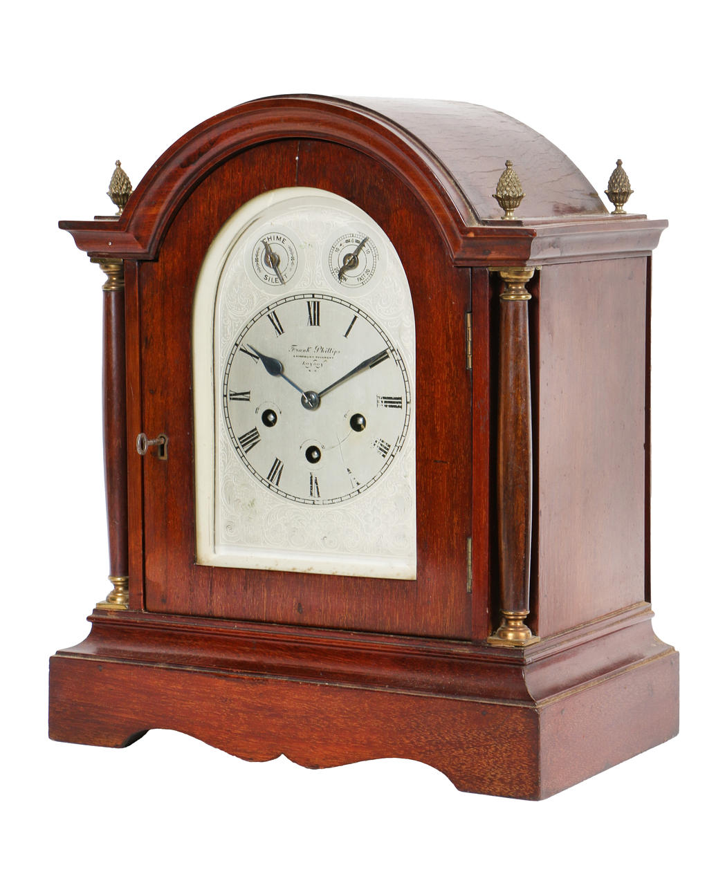 retailed by Frank Phillips, 4 Finsbury Pavement, London E.C, arched case with cast brass pineapple finials, freestanding columns and glazed bevelled door, on a plinth base, to a signed and silvered 6 1/4 dial with chime silent and regulation subsidiaries, to a triple barrel brass movement with anchor escapement and strike on four roads and coiled gong, 40cm high and 33.5cm wide.