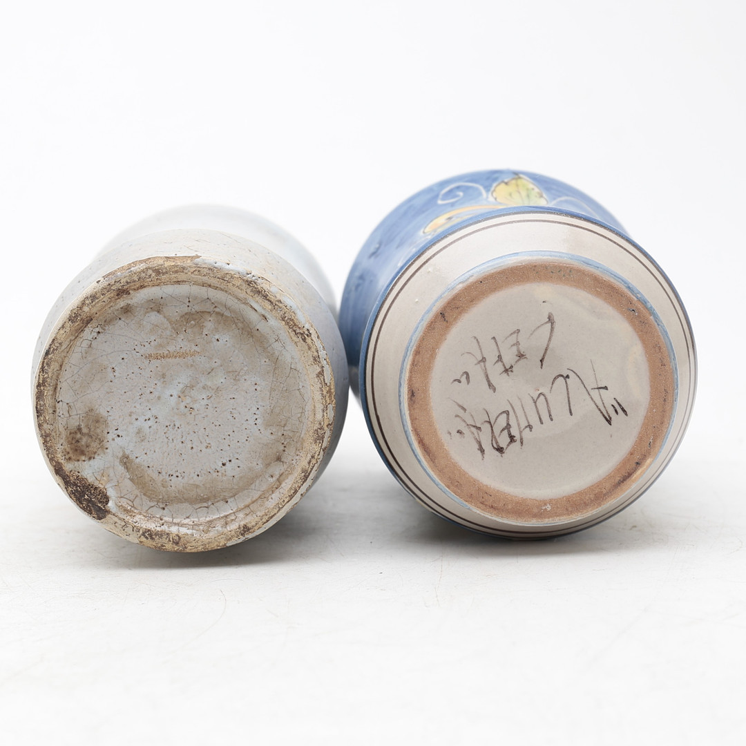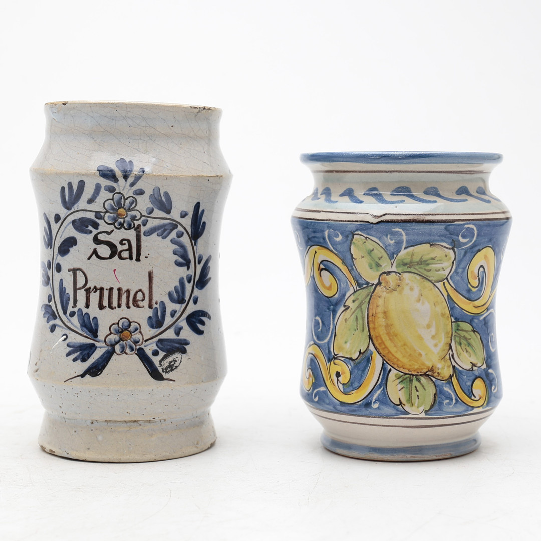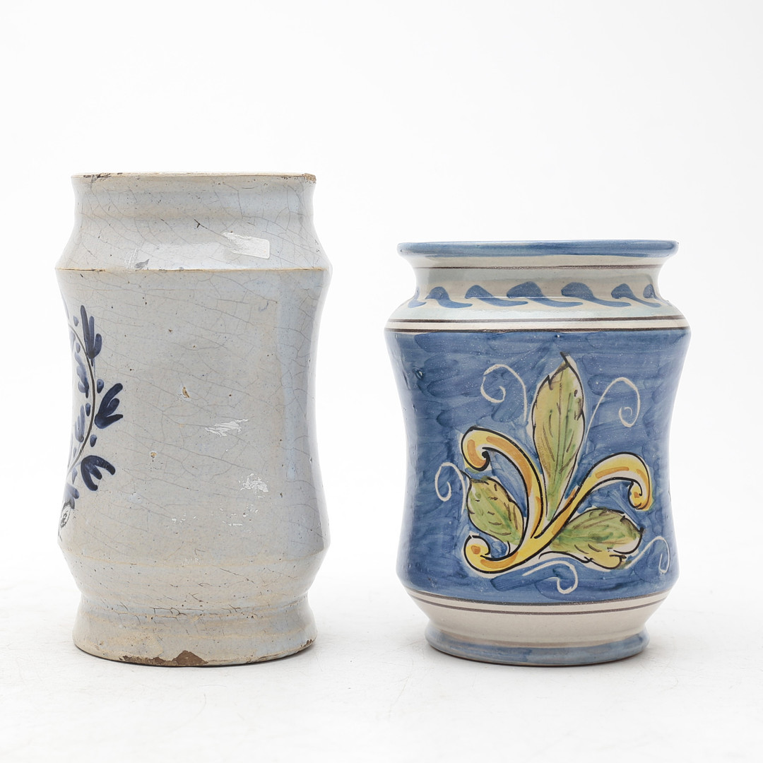 4425878. Two earthenware pharmacy jars, 20th Century.