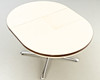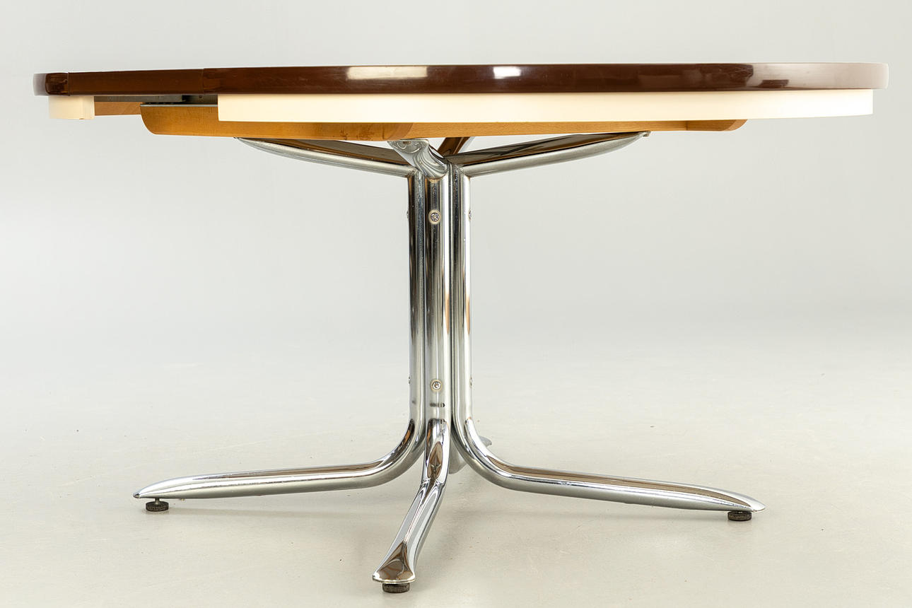 Round table that can be pulled out, with a chrome-plated base and a laminated wood table top.