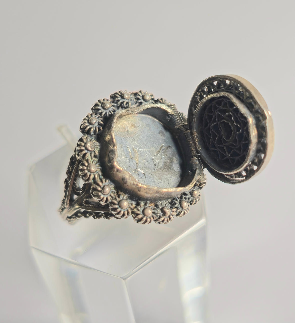 FILIGREE AND TURQUOISE STERLING SILVER RING. INNER BOX.