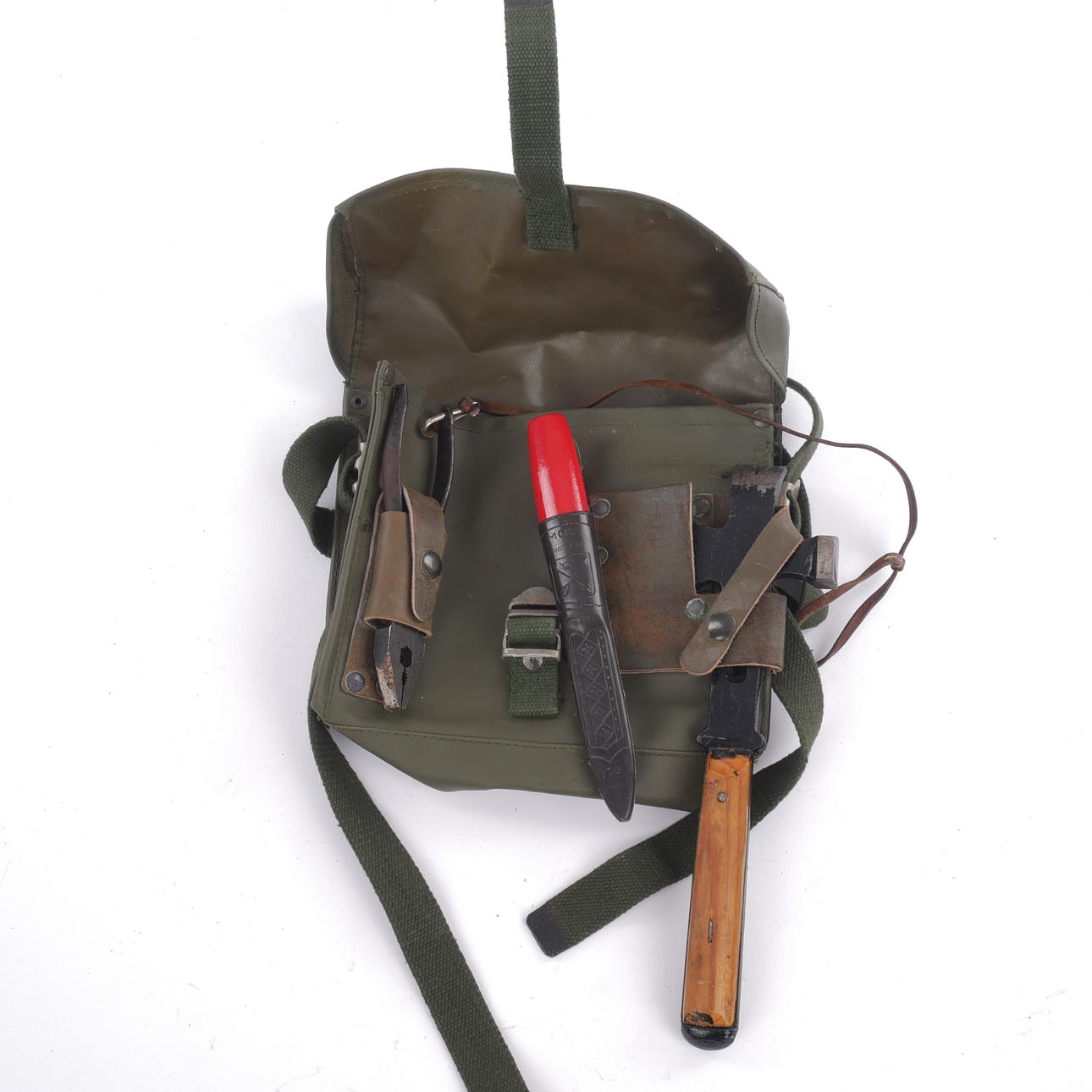 Military line bag approx. 23x23 cm - hammer/ax, mora knife, combination pliers marked “Piano Wire Lindström Sweden” and with three crowns.