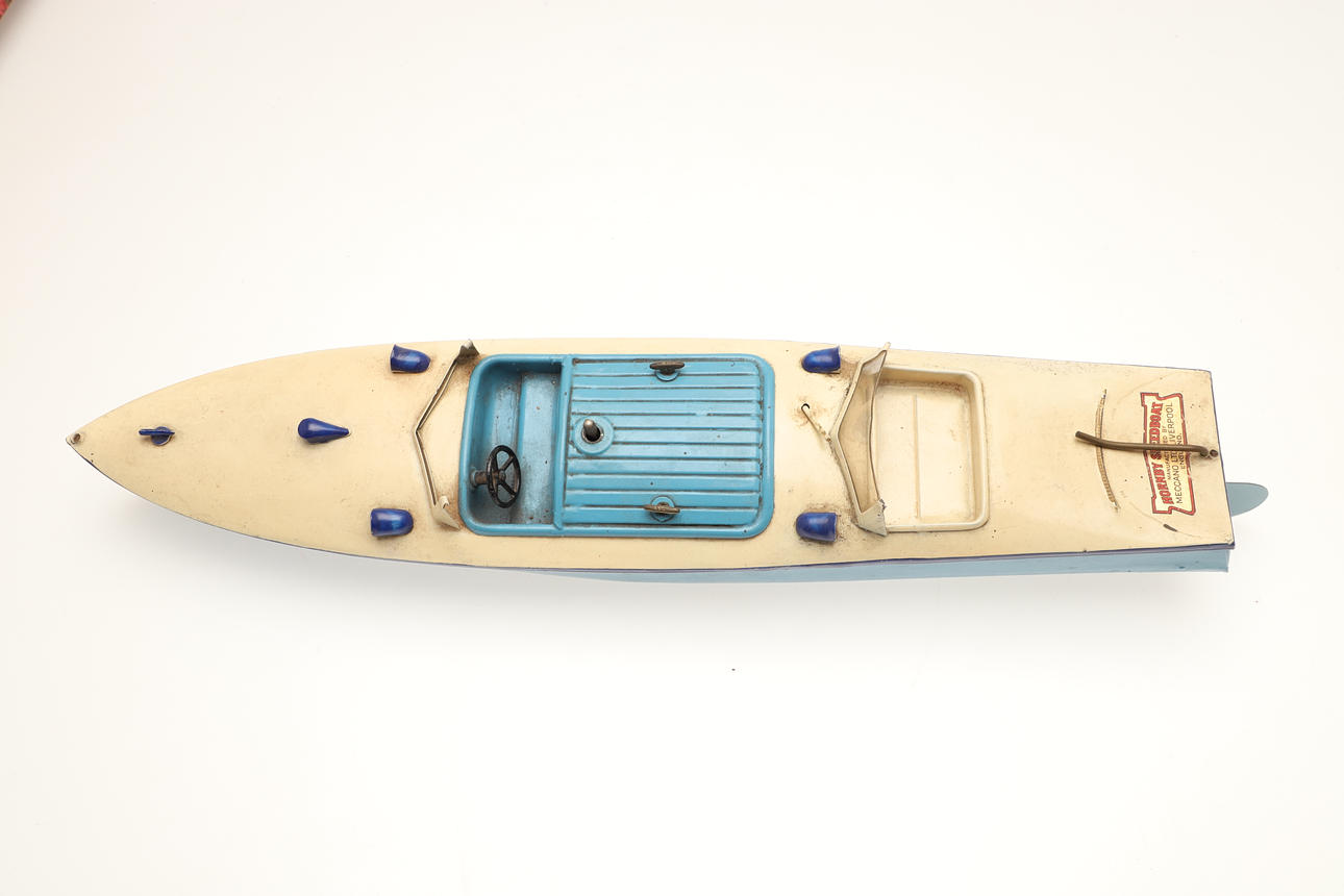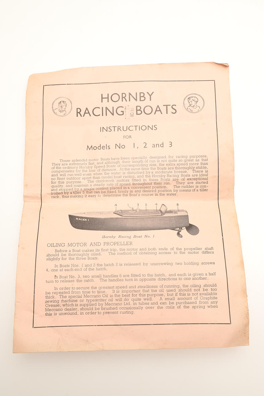 A tin plate Hornby No 3 Racer III model speed boat, with a clockwork mechanism and with it's key and part of it's box. Also with an instruction booklet. 41cms long, box 46cms long.