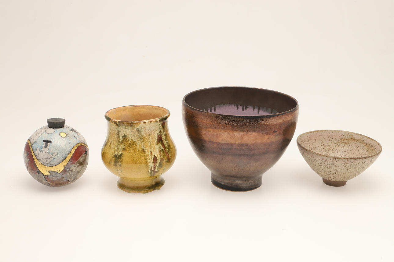 To include a large bowl by Sarah Perry, height 13.5cm, diameter 17cm). A decorative urn/vase, height 12cm and two other studio pottery items. (4).