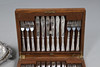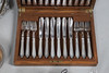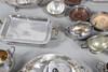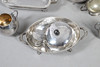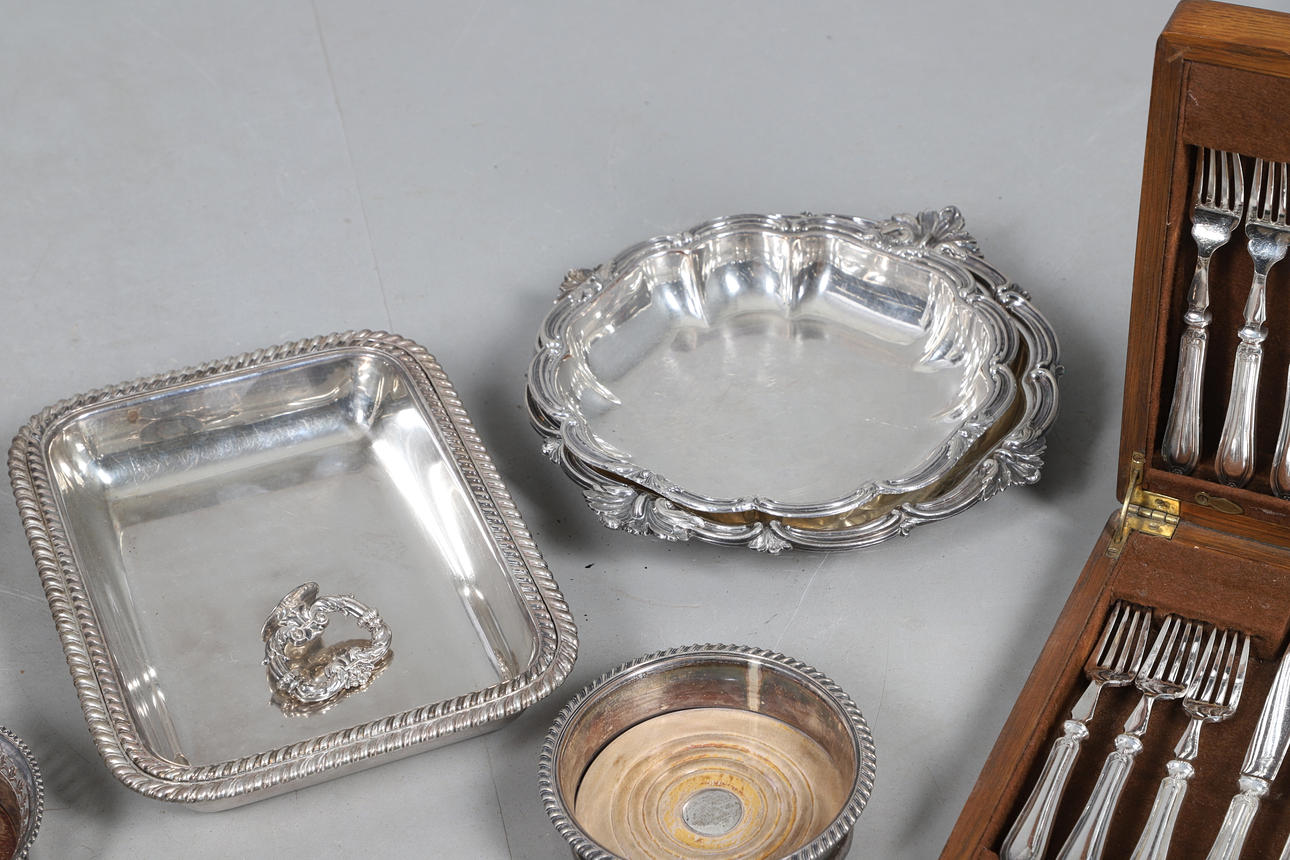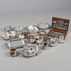 To include a wooden cased 12 place set of knives and forks (case measures Height 6cm x Width 34cm x Depth 26.5cm), coasters, tea ware, a three piece foliate engraved tea set (teapot, twin handled bowl and jug), entrée/serving dishes, three piece cruet set and other related items etc. Please see online images.