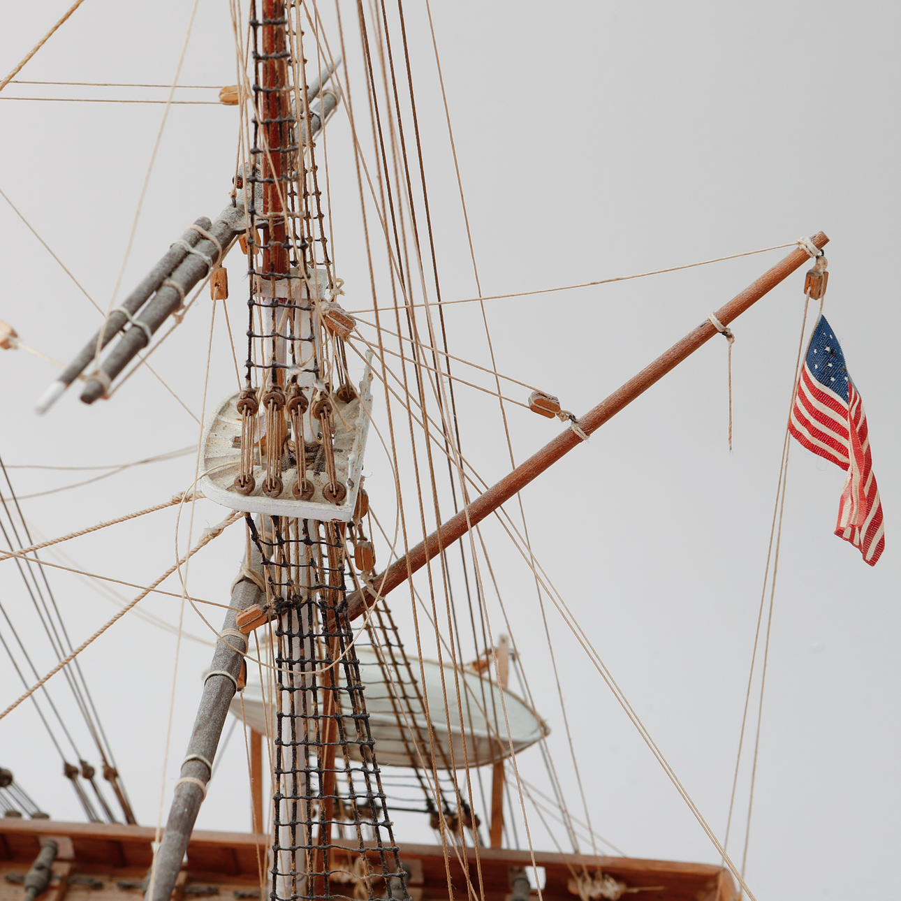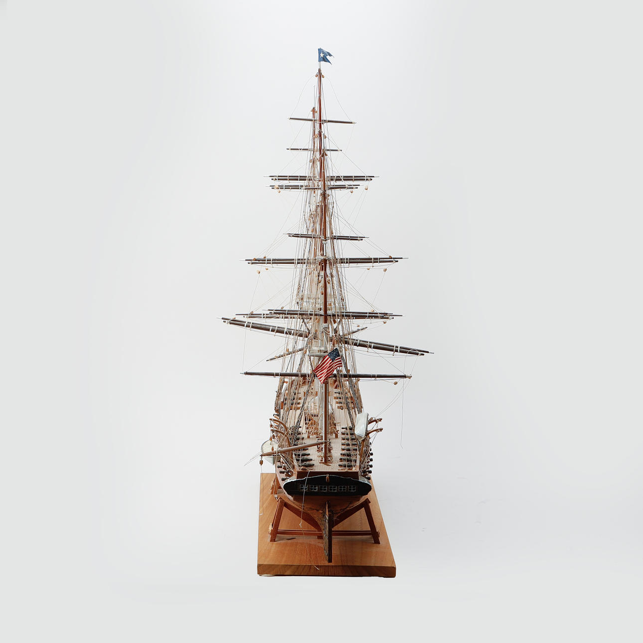 Three masts. Armored with 54 guns and 3 lifeboats. Flag of America.